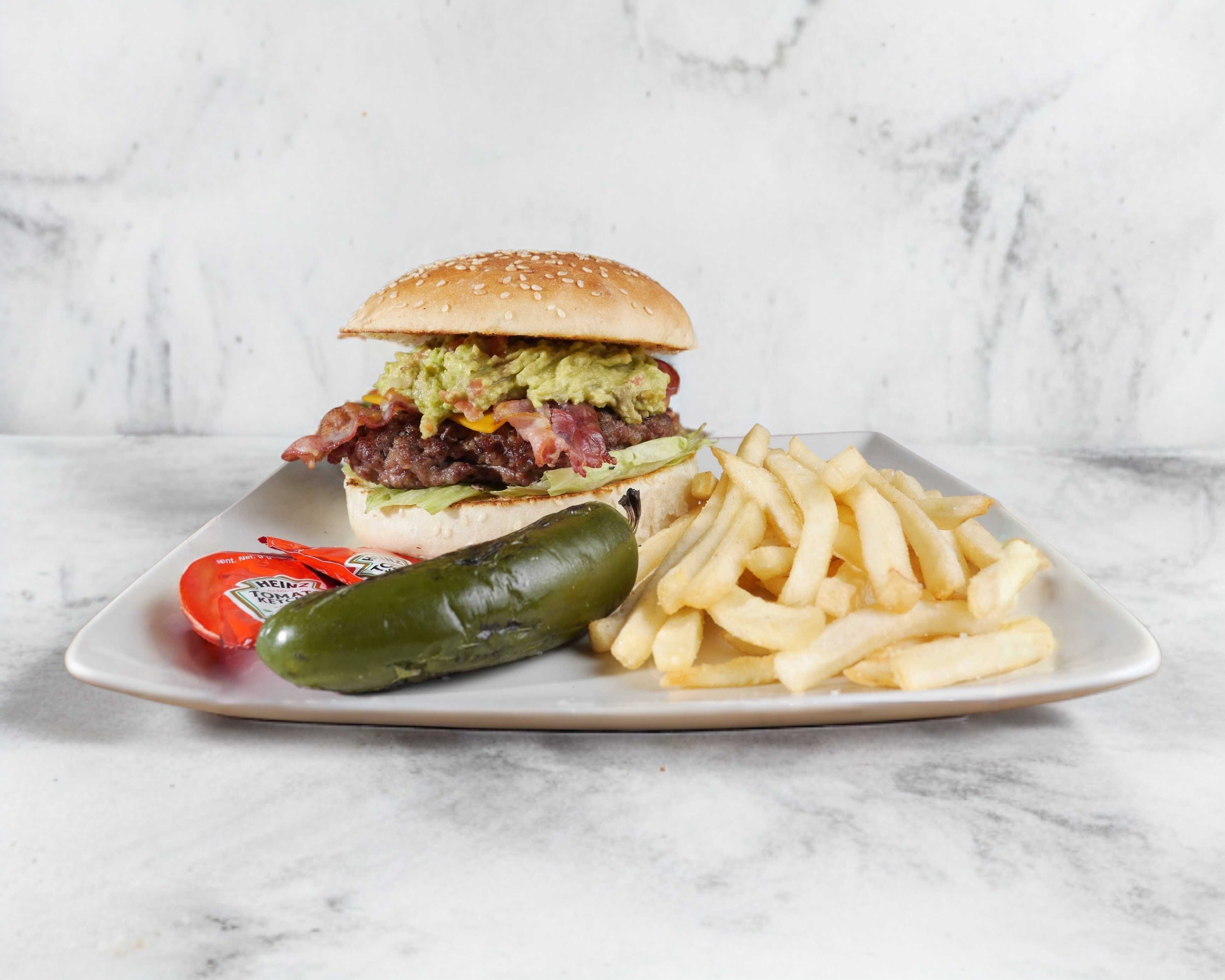 170 gr de carne de res, queso americano, lechuga, tomate, cebolla cruda, mayonesa, tocino y guacamole preparado, acompañada de papas a la francesa.