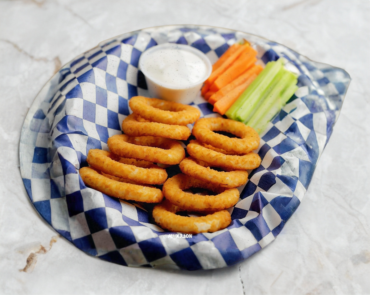 10 piezas de aros de cebolla acompañados de apio, zanahoria y aderezo ranch