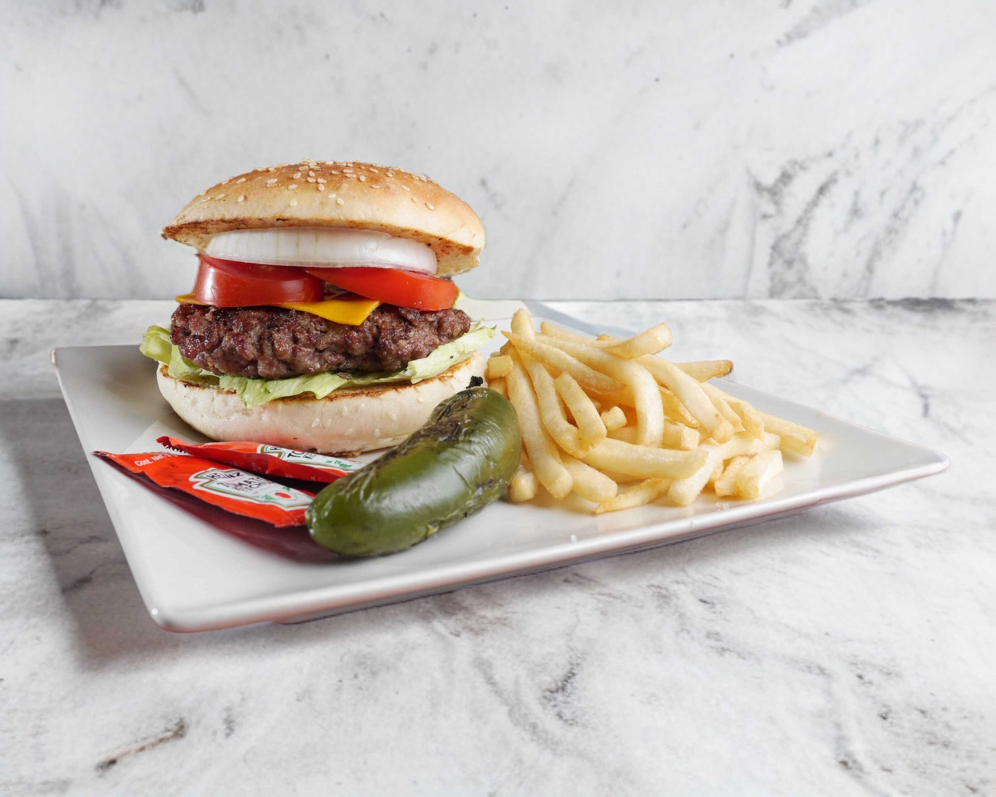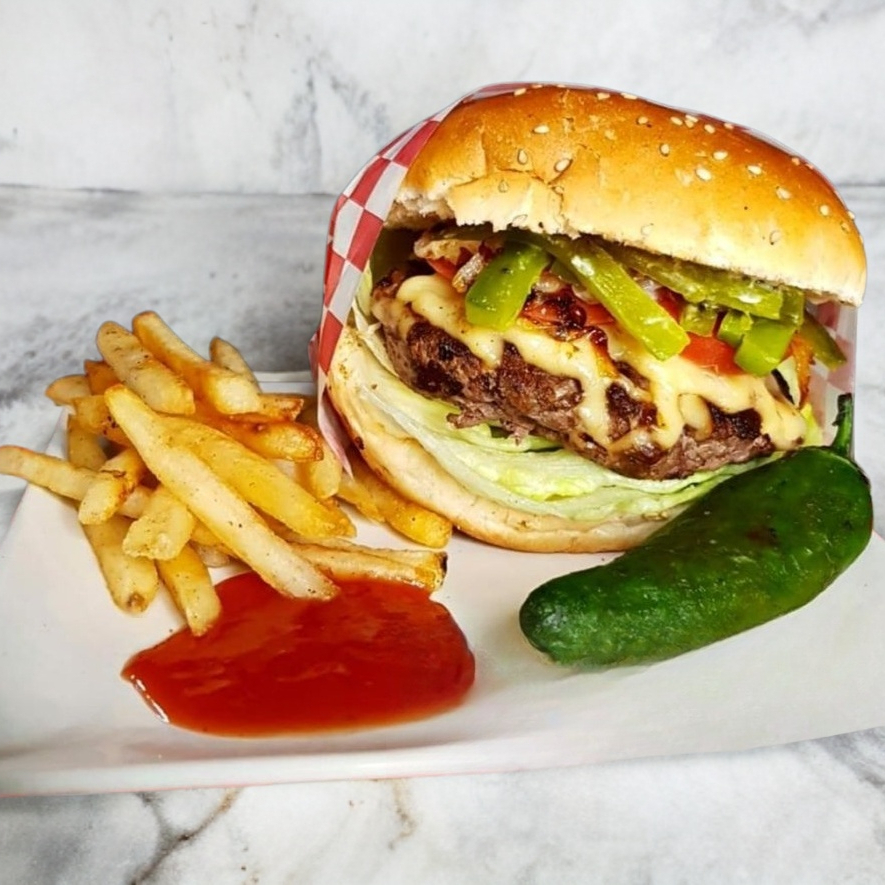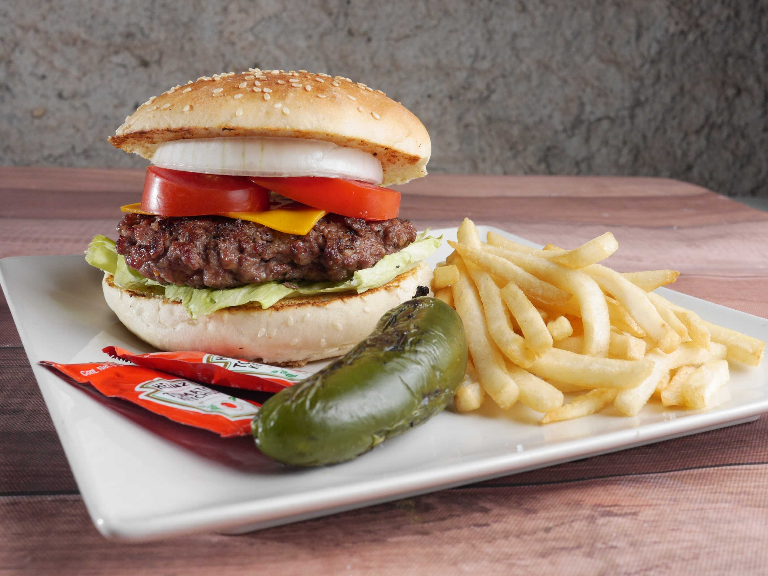 170 gr de carne de res, queso chihuahua, lechuga, tomate, mayonesa, cebolla asada, chile verde tatemado, acompañada de papas a la francesa.