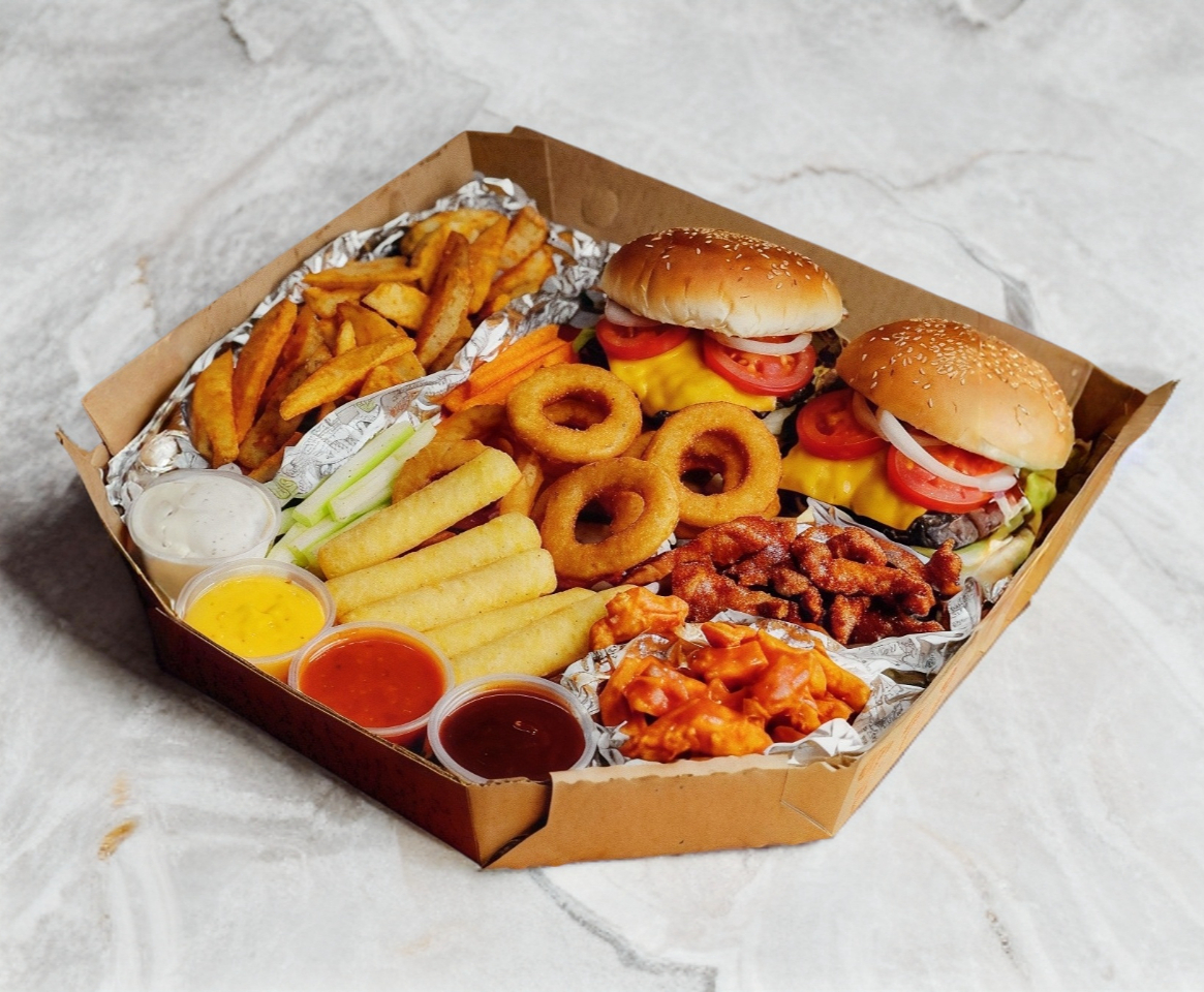 Incluye 2 hamburguesas tradicionales, 1 orden de boneless, 1 orden de dedos de queso, 1 orden de aros de cebolla y 1 orden de papas sazonadas, acompañado de aderezos.