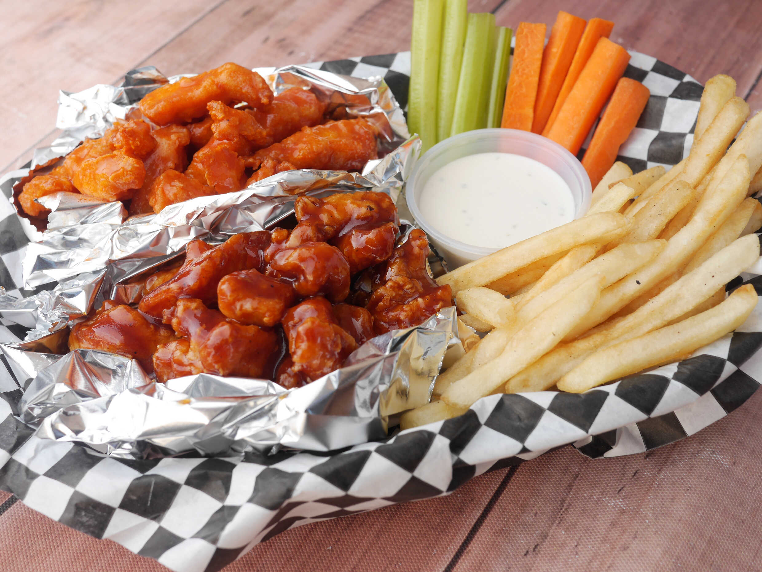 210 gr de tiras de pollo empanizadas, bañadas en salsa a elegir, elegir tipo de papas , aderezo ranch.