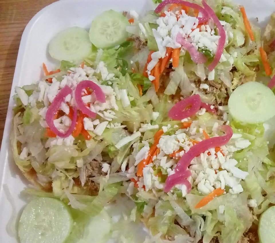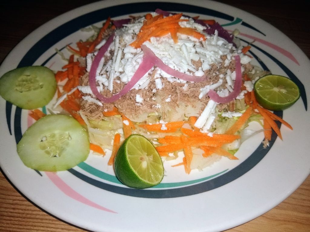 Cama de lechuga, carne de res o pollo, papa, zanahoria, pepino cebolla curtida, queso( Consomé y salsa)