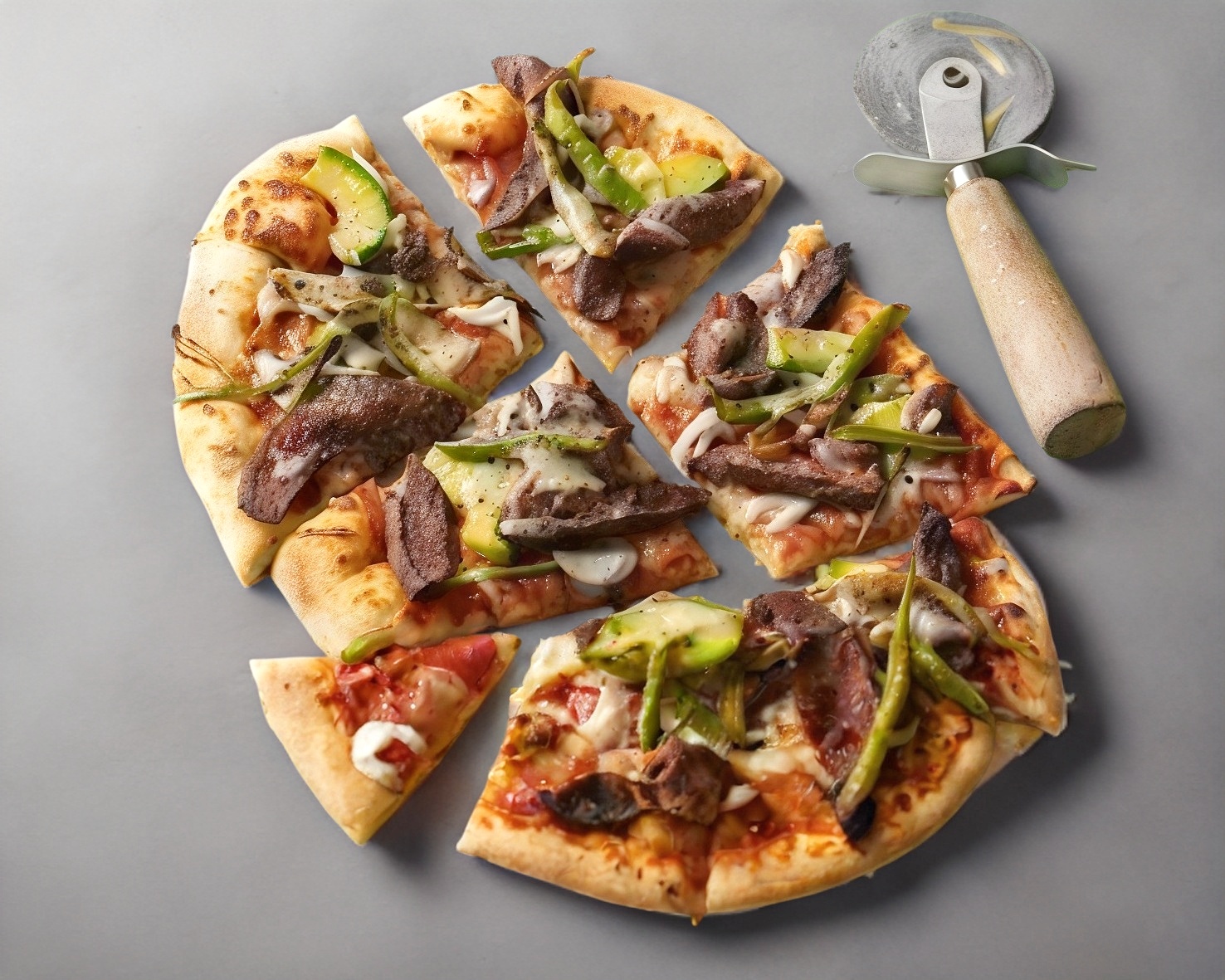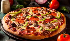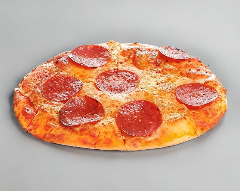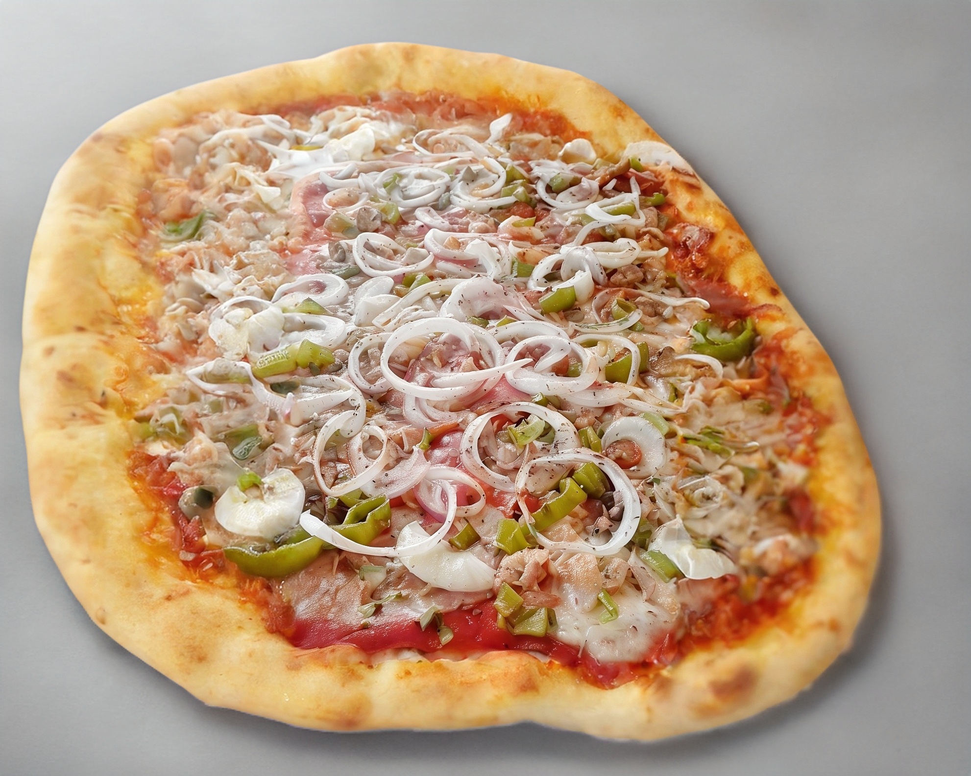 Pepperoni, cebolla, pimiento, aceituna negra y carne molida.
