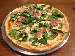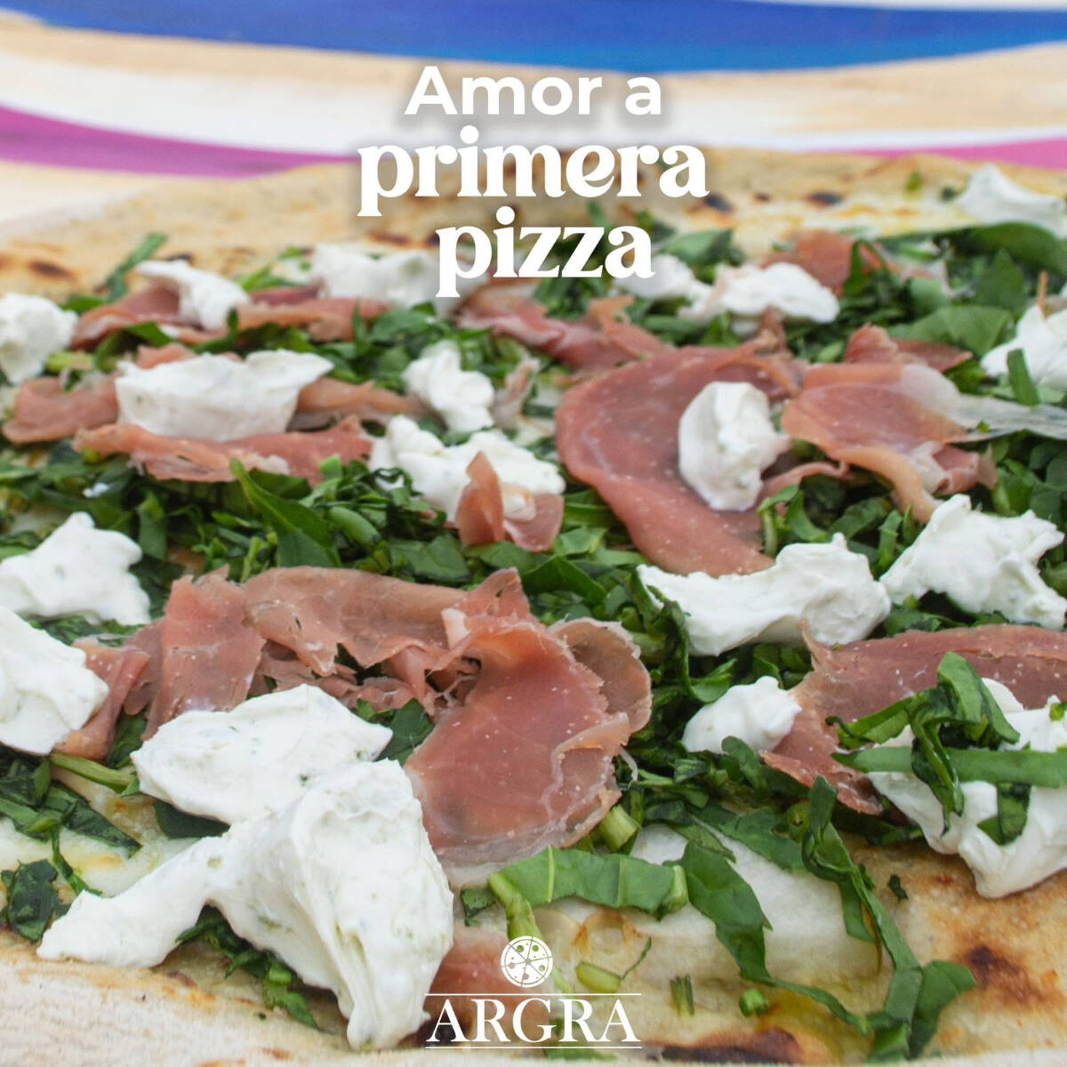 Base de salsa blanca (alfredo), pera caramelizada, espinaca, jamón serrano y queso de cabra.