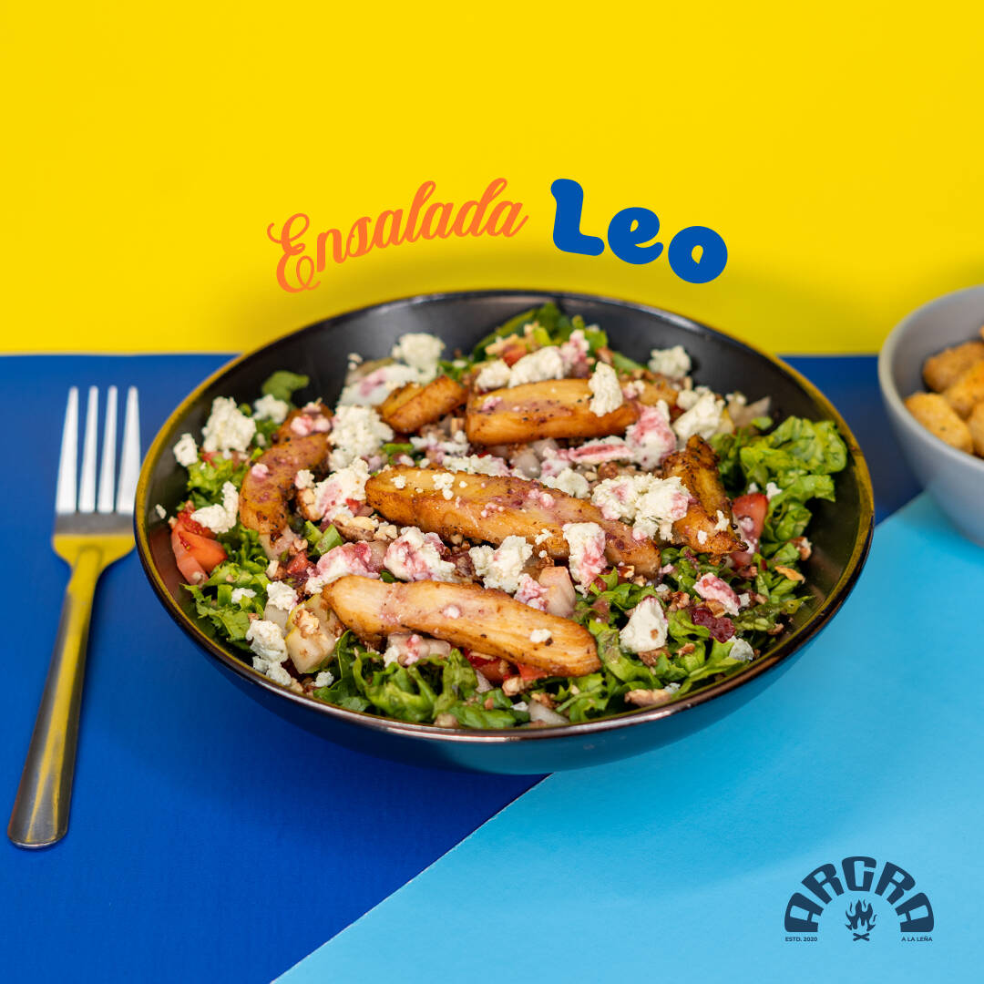 Mix de lechuga y espinaca, pollo, pera, tomate cherry, pera, pimiento, crotones y parmesano, bañado en vinagreta de mostaza miel.