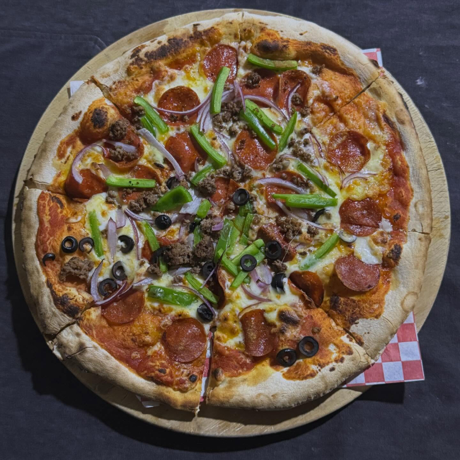 Pepperoni, cebolla morada, pimiento, meet bols, aceituna negra.