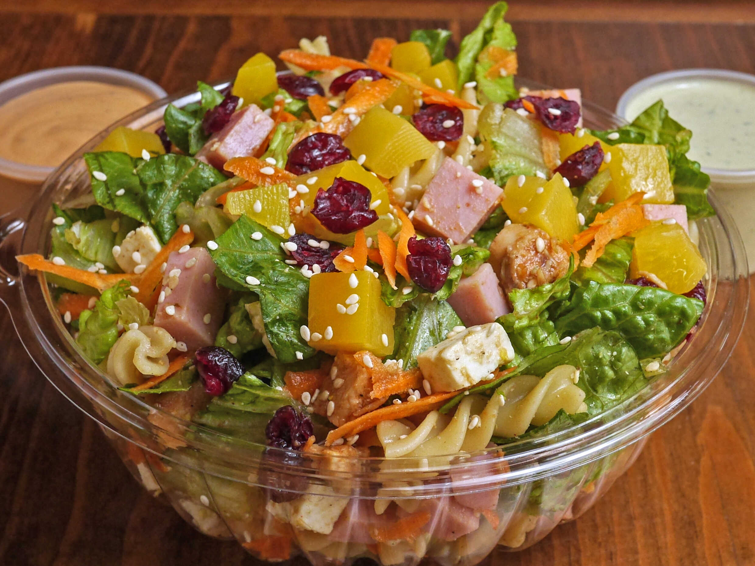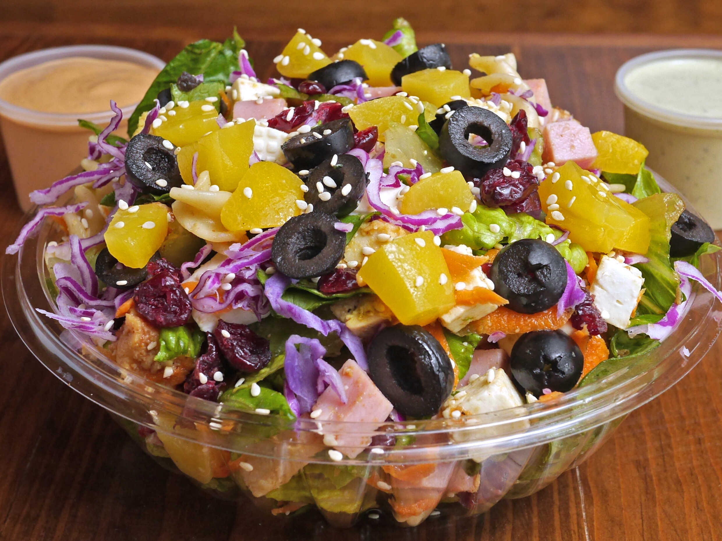 3 Porciones de vegetales, 1 porción de proteína, 2 aderezos, porción fritura o crotón.