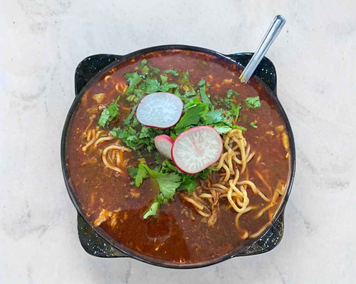 pasta ramen japones cocido al dente, sazonada en consome de birria , con carne estilo tijuana.