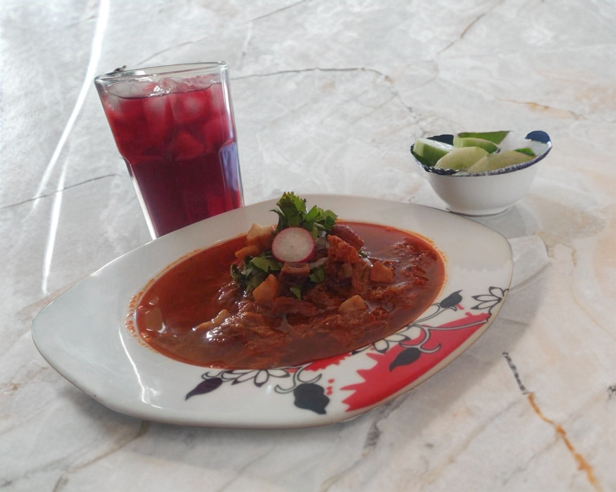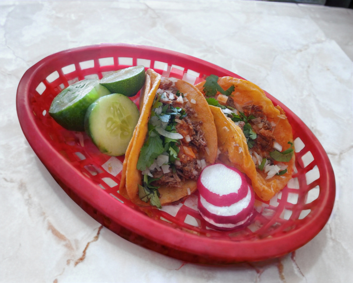tacos de maíz con tortilla sazonada, carne de birria y complementos a parte, acompañado de consome calientito.