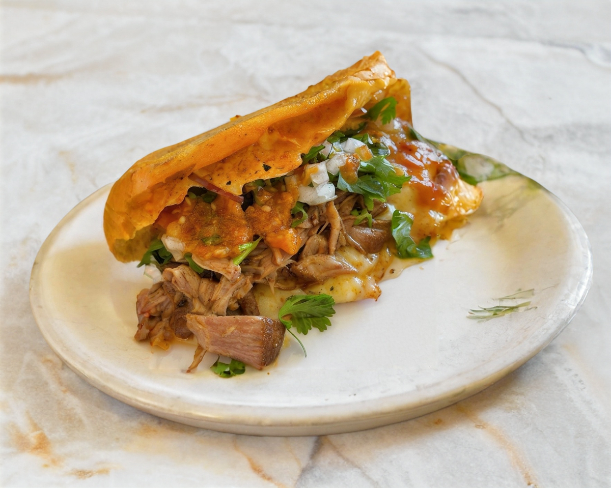 Doble tortilla, doble queso, con tortilla de maíz doradita.