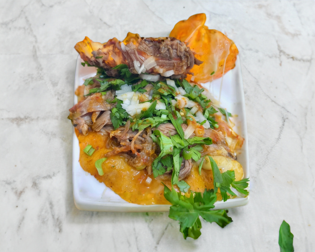 percheron de birria, queso gratinado,cilantro, cebolla, aguacate.