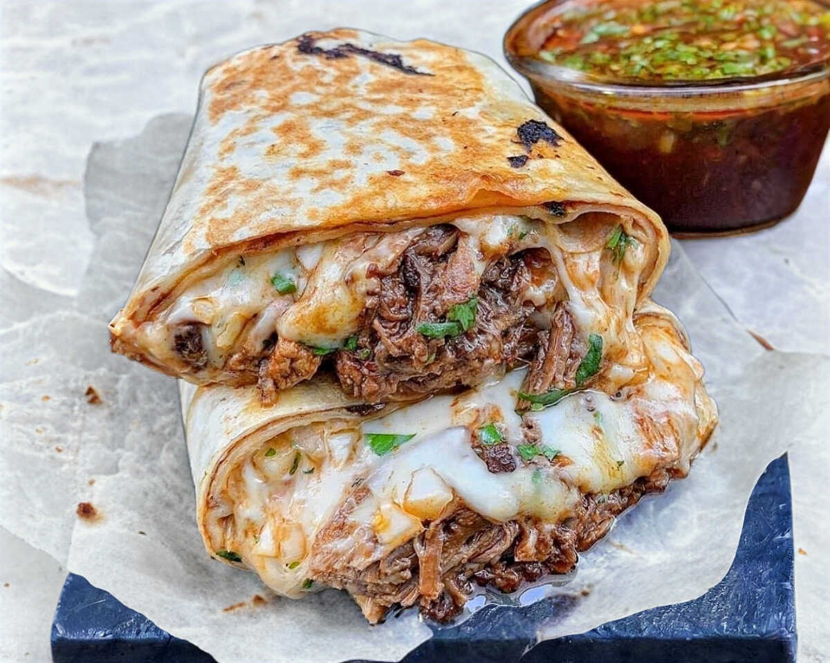 Tortilla de harina regular, con queso gratinado y carne de birria.