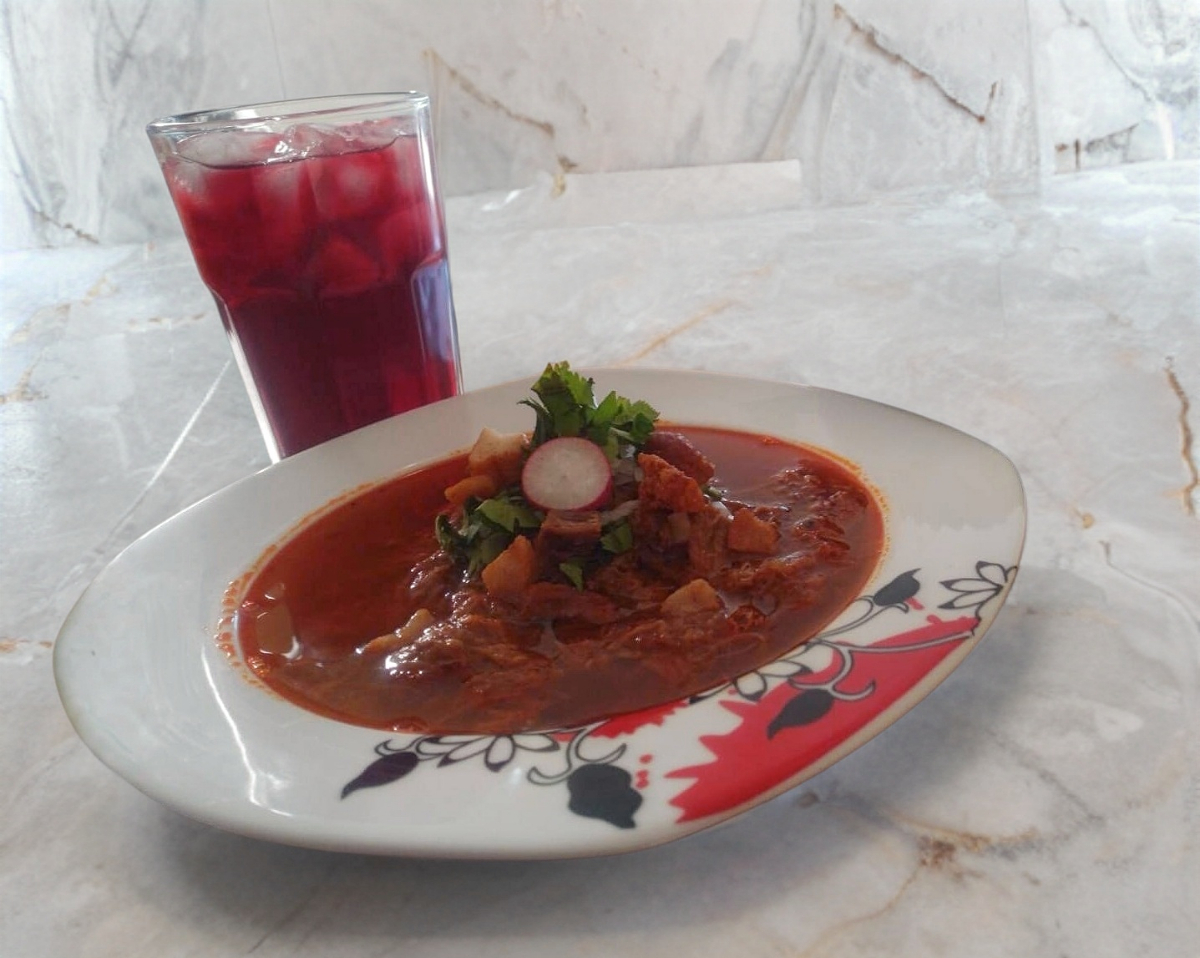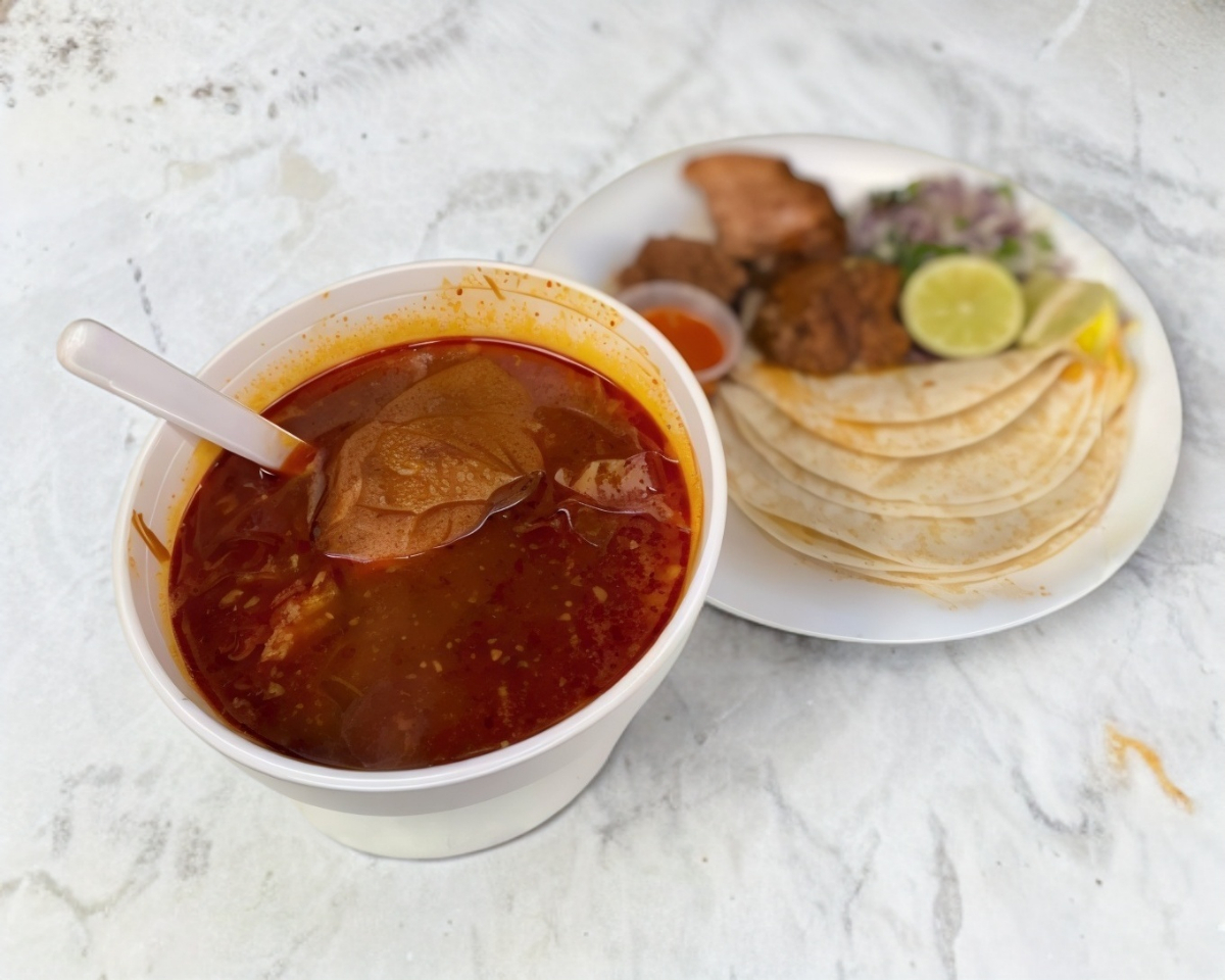 Media orden de birria de res, con verdura y tortillas de maíz.