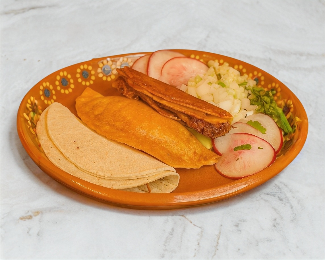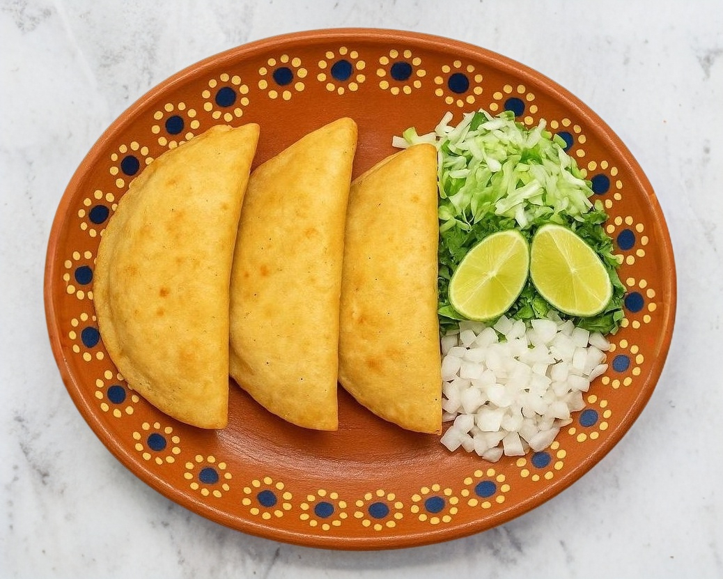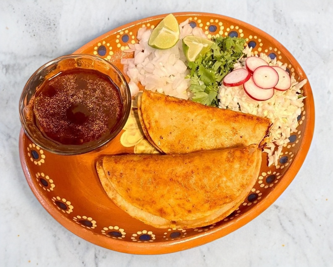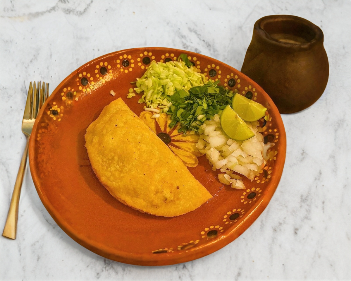 1 empanada, 1 quesabirrias y 1 taco + un vichi