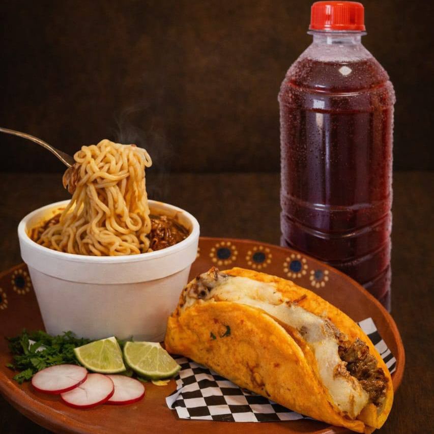 Medio litro de Birriamen + 1 Quesabirria + 1 agua de Jamaica