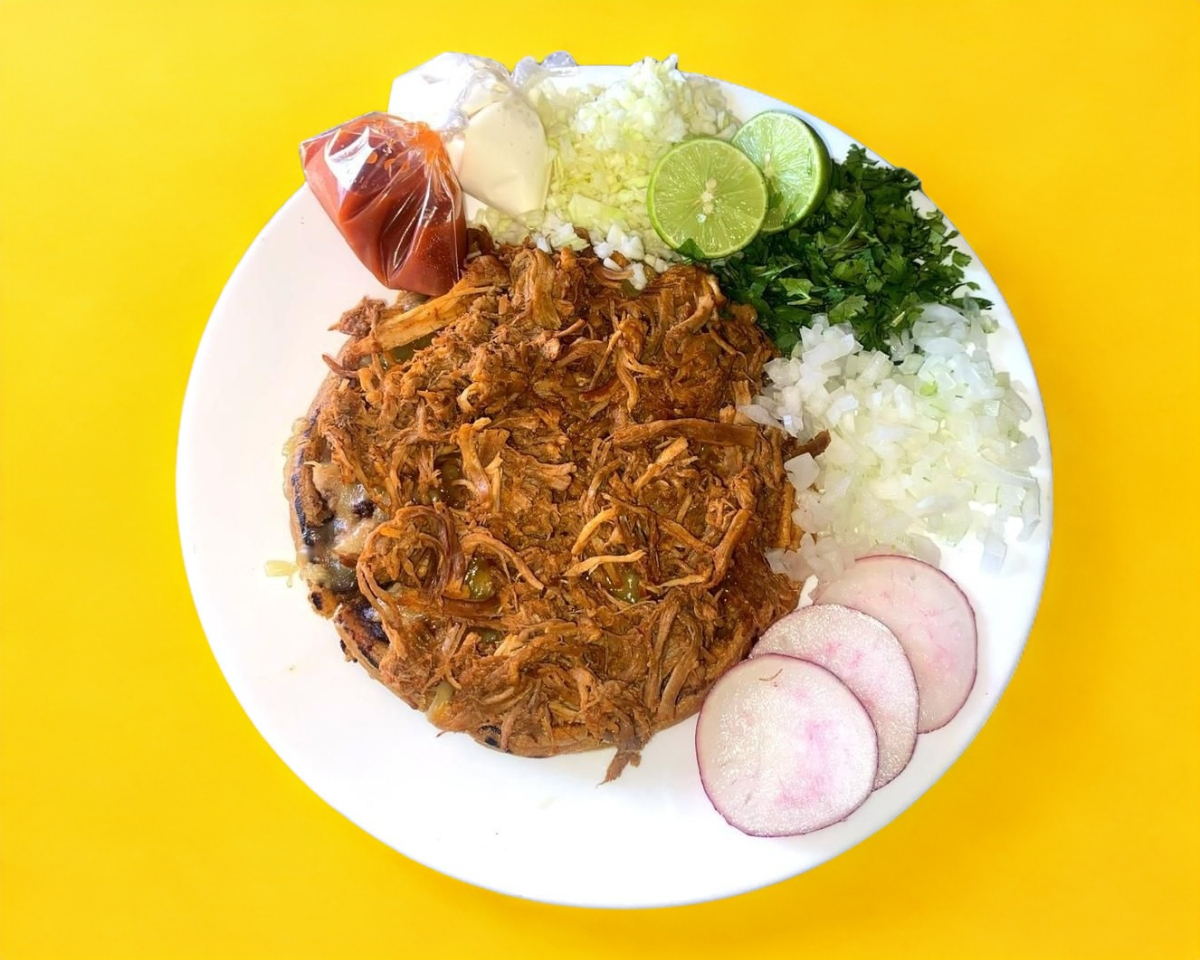 Gordita de maseca con carne y queso derretido. Incluye verdura y salsa