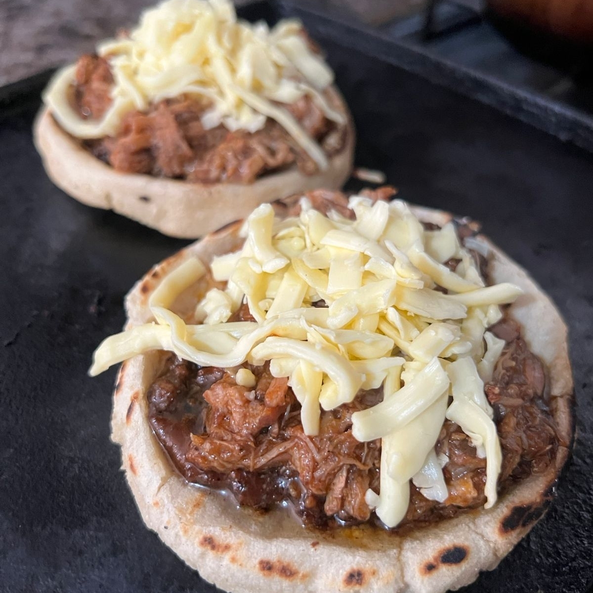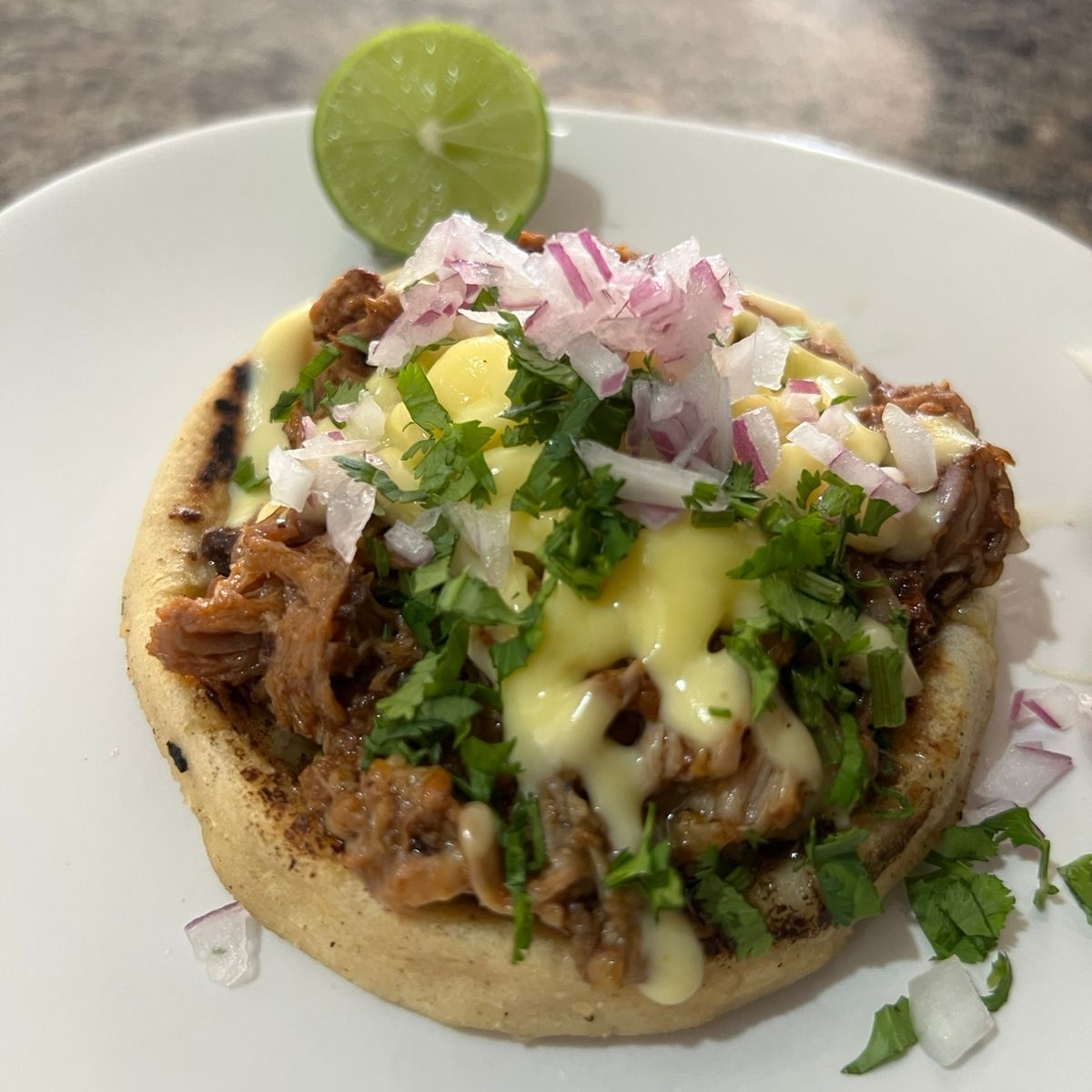 Gordita (sope) de maiz con asiento y carne de birria de res gratinado con queso gouda acompañda de verdura picada y salsa