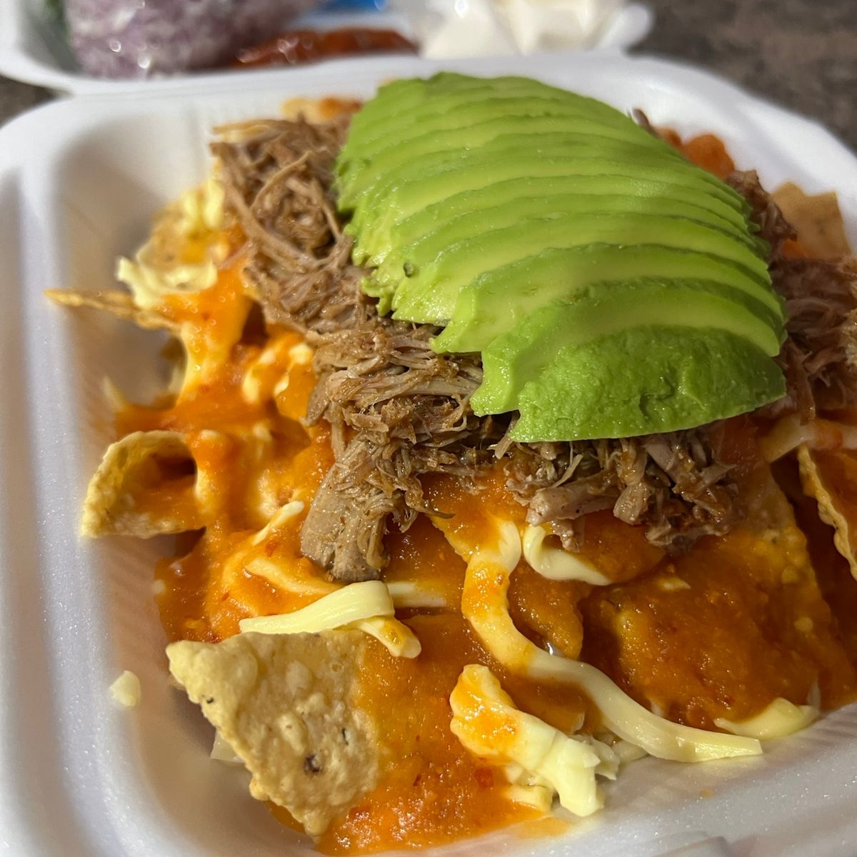 Totopo bañado en salsa especial, queso gouda, carne de birria de res, crema y aguacate, acompañado de consomé de birria. Incluye servicio de verdura.