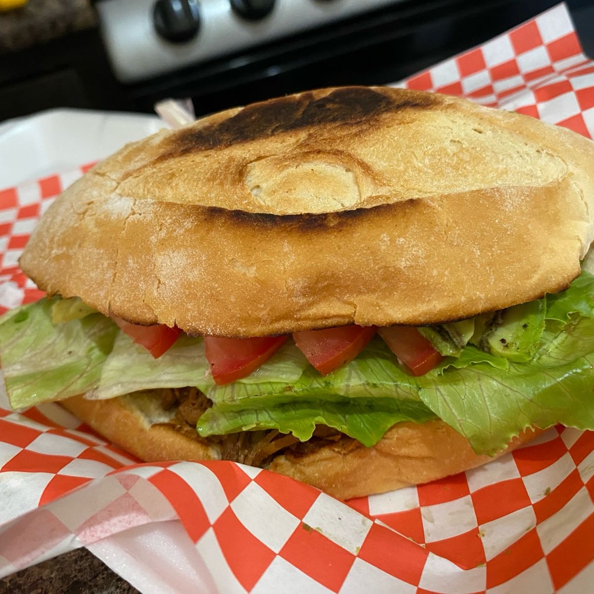 Pan y carne de birria de res, con tomate, lechuga, aguacate y chiles jalapeños
