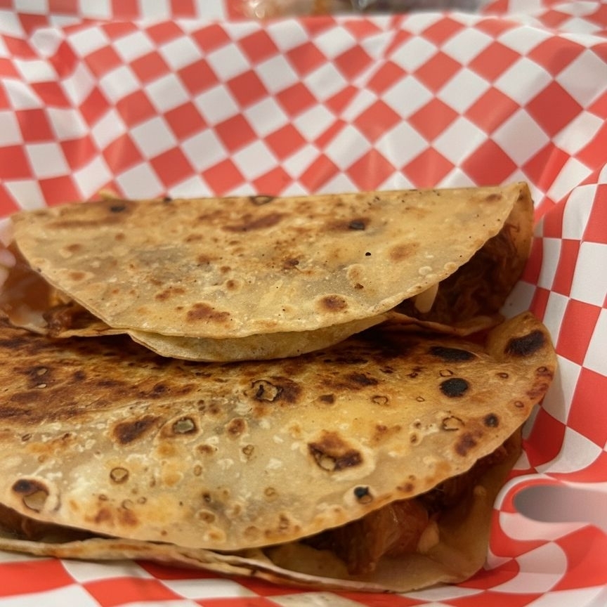 Doble tortilla de maíz rellena de queso gouda y carne de birria de res, bañada en consomé de birria. Incluye servicio de verdura.