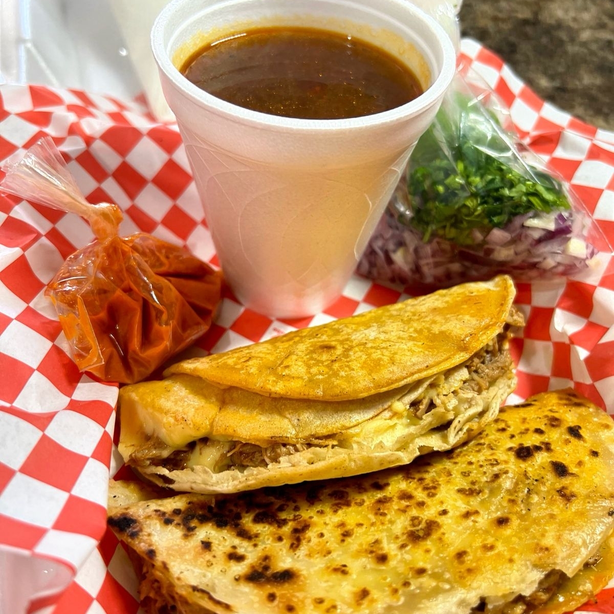Dos quesabirrias con tortilla doble y un vichi. Incluye servicio de verdura.