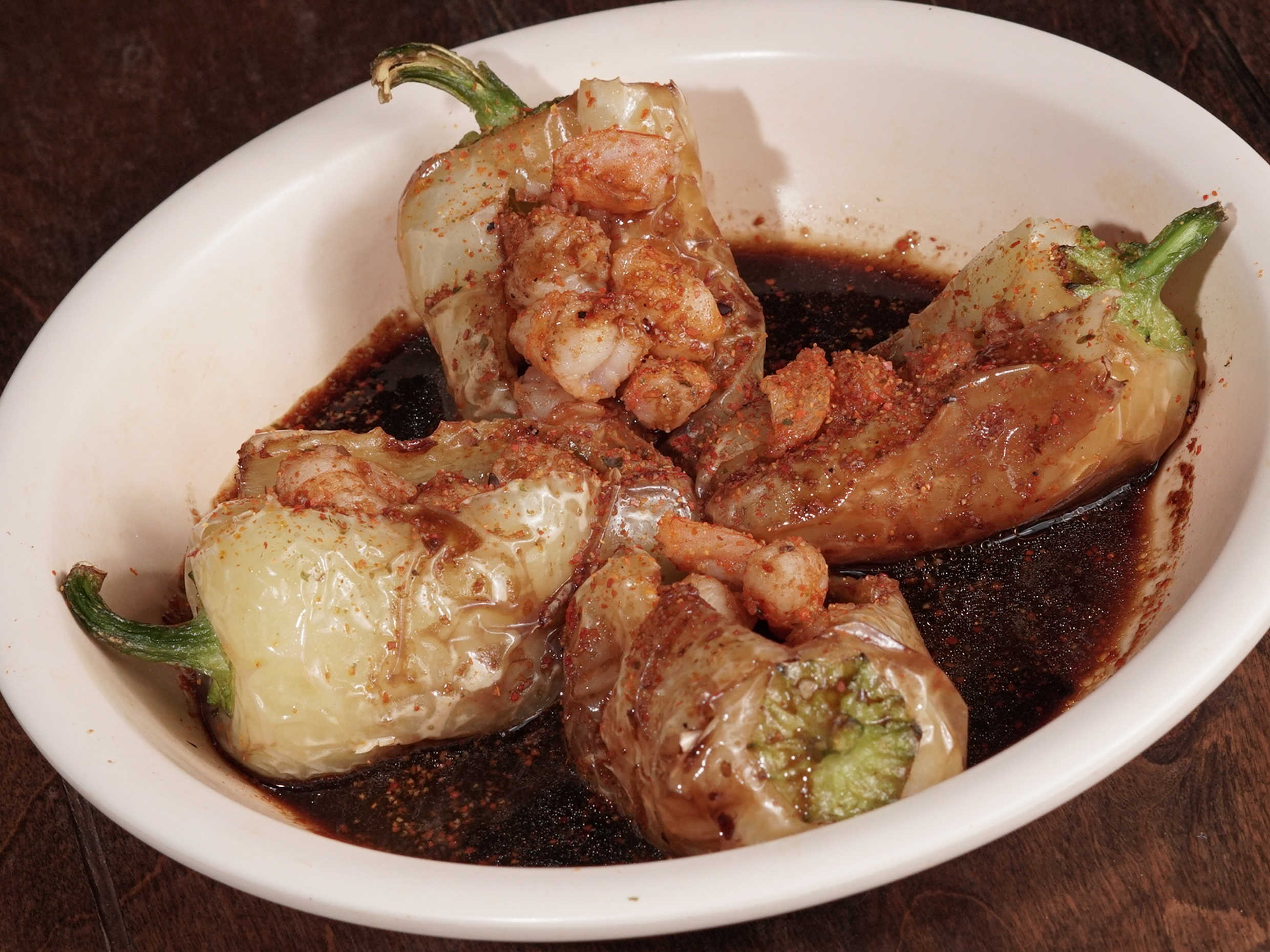 Chile caribe relleno de camarón, bañado en salsa de soya y aguachile negro.