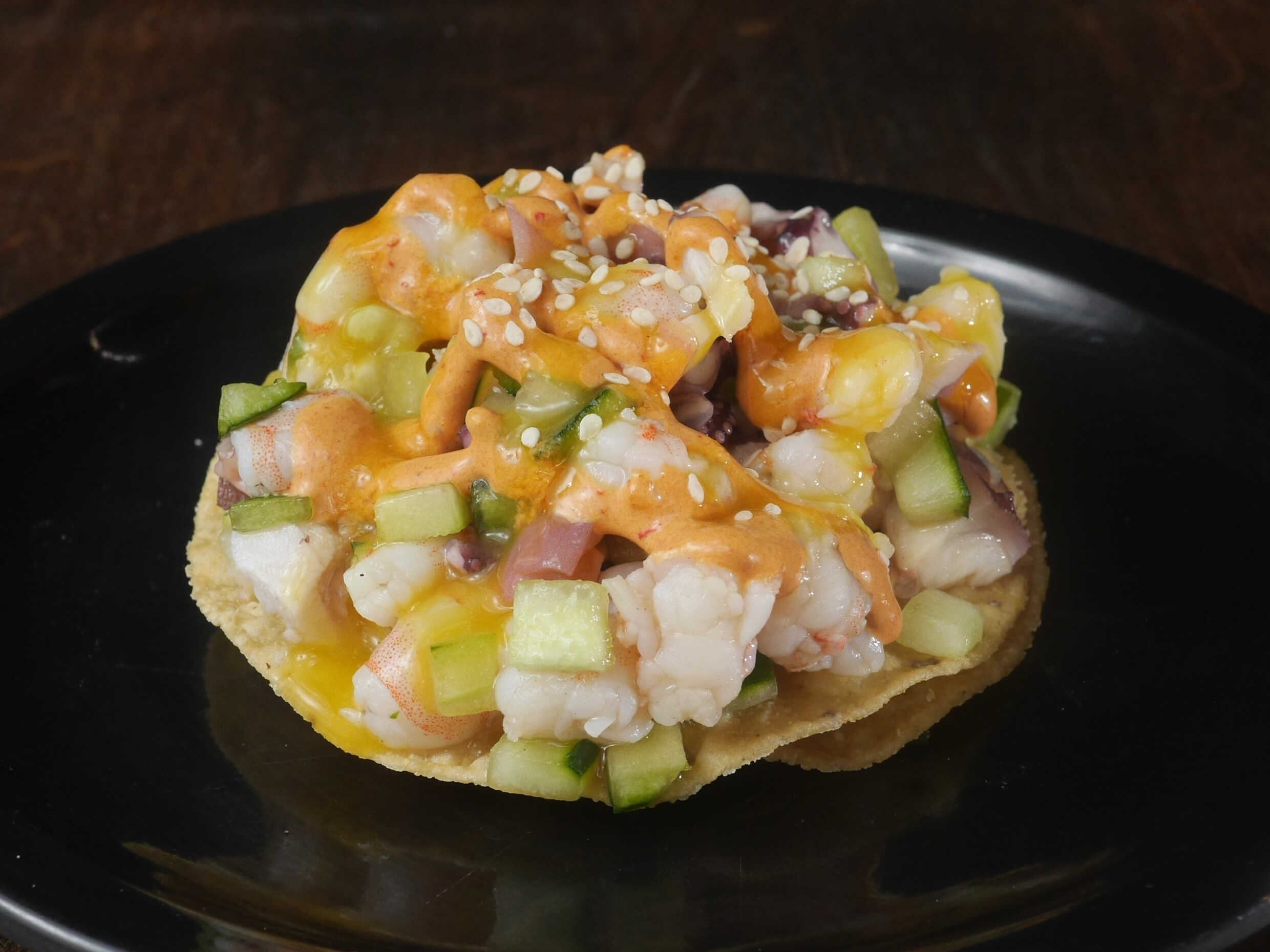 Mezcla de Marisco fresco en soya y pepino, sobre una cama de Tostitos y bañado en aguachile negro y aderezo de chipotle.
