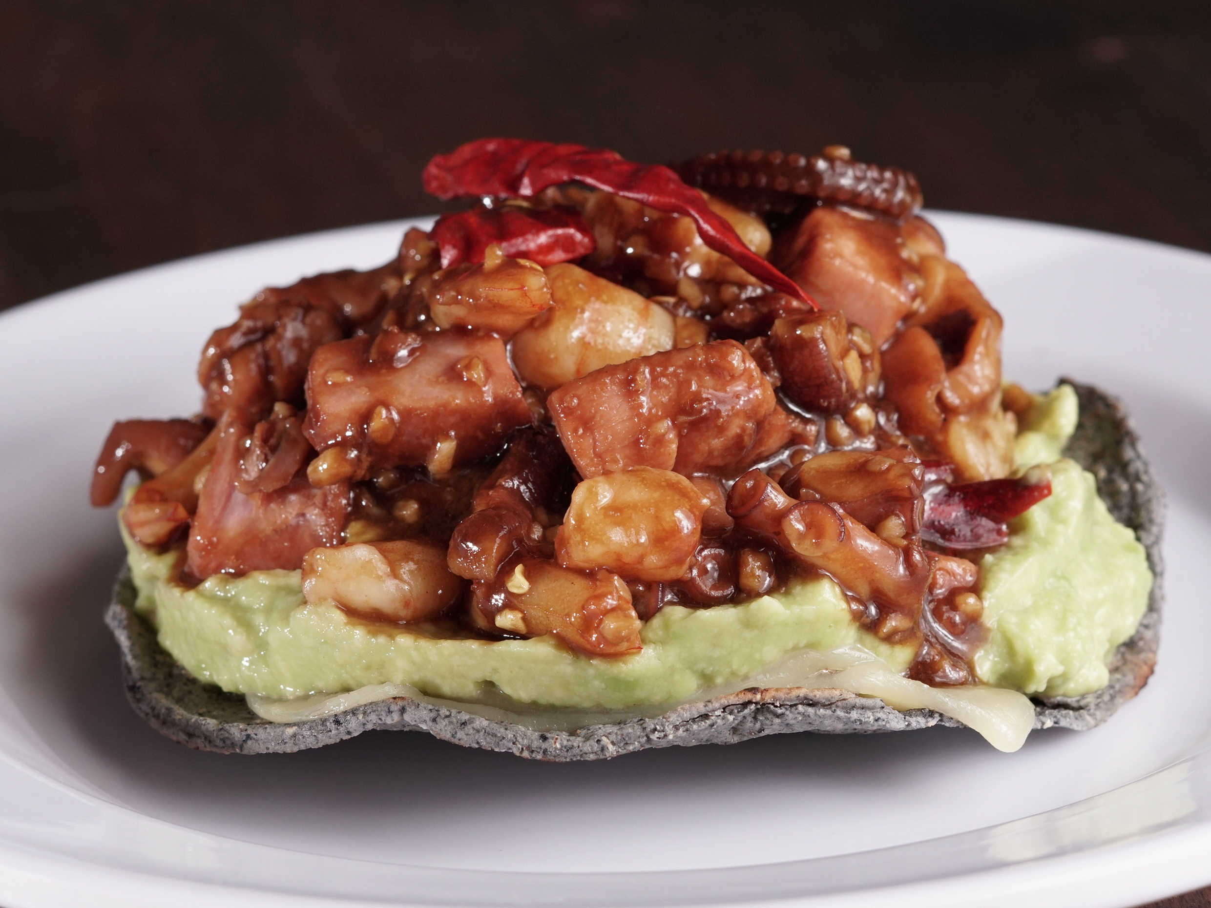 Tortilla dorada al carbón, queso gouda derretido, cama de aguacate, camarón, pulpo y atún. Guisado a la mantequilla y especies, bañada en salsa agridulce.