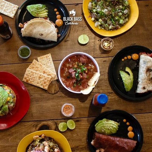 Mezcla de pulpo cocido, callo de pescado, camarón crudo y cocido, con pepino y cebolla morada en aguachile black bass.
