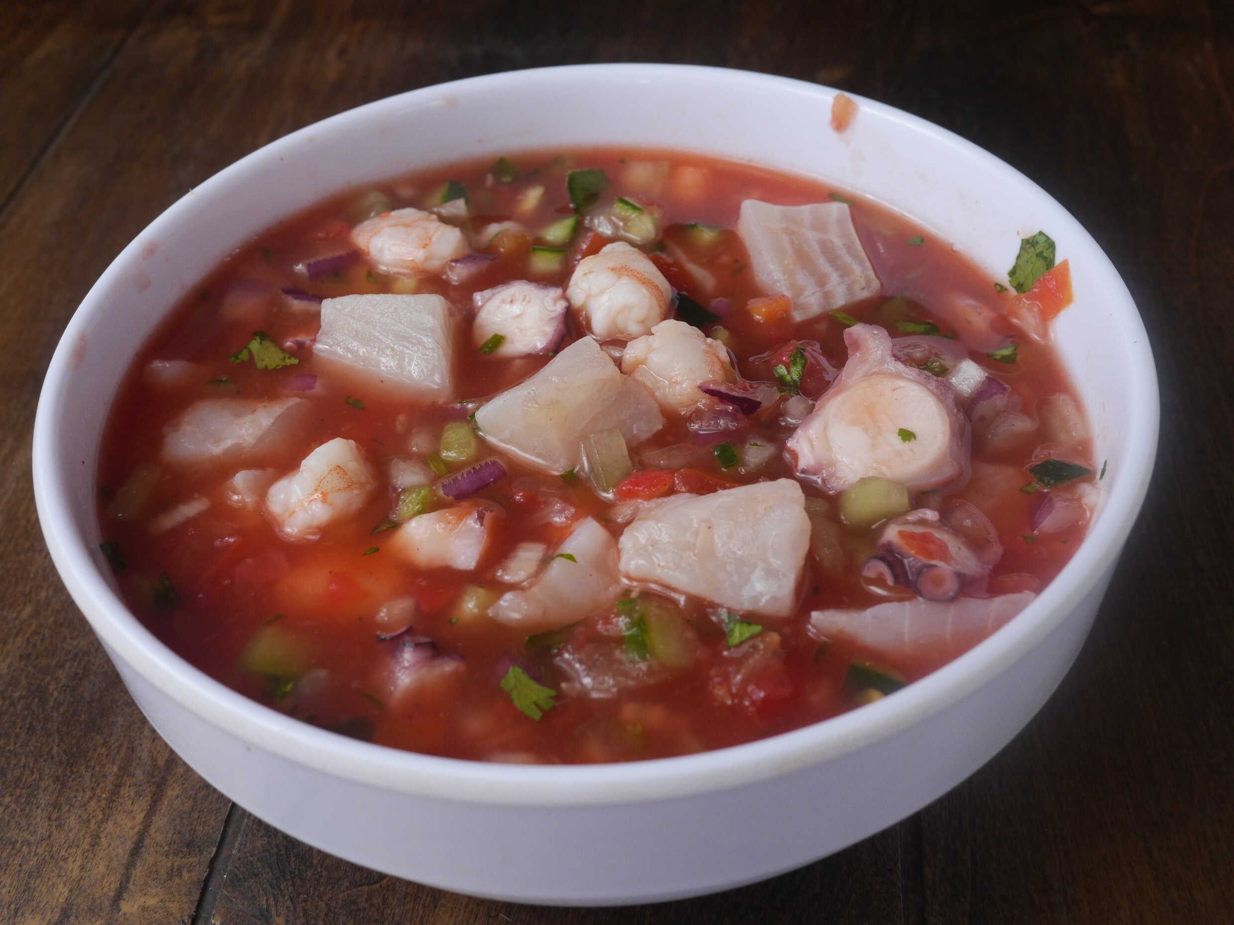 Mezcla de ceviche de pulpo cocido, pescado y camarón crudo.