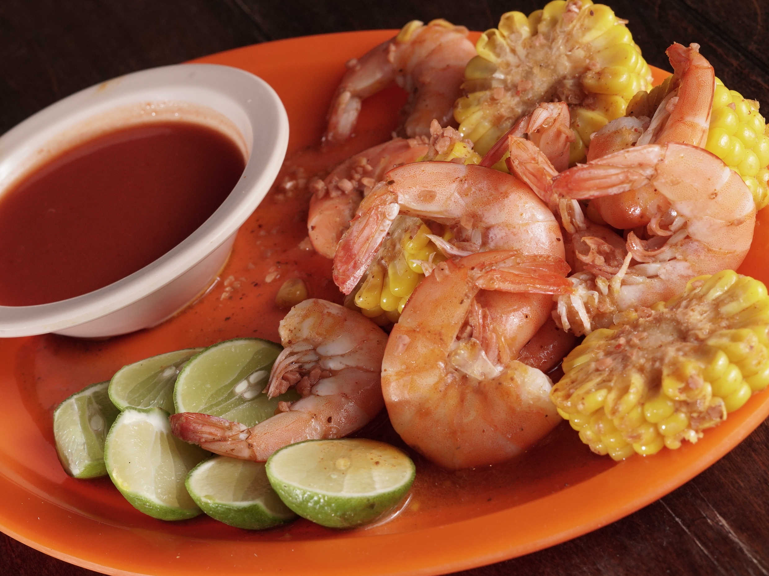 Camarón cocido y elote dulce en una salsa de especies a base de ajo y mantequilla, dentro de una bolsa para su mezcla.
