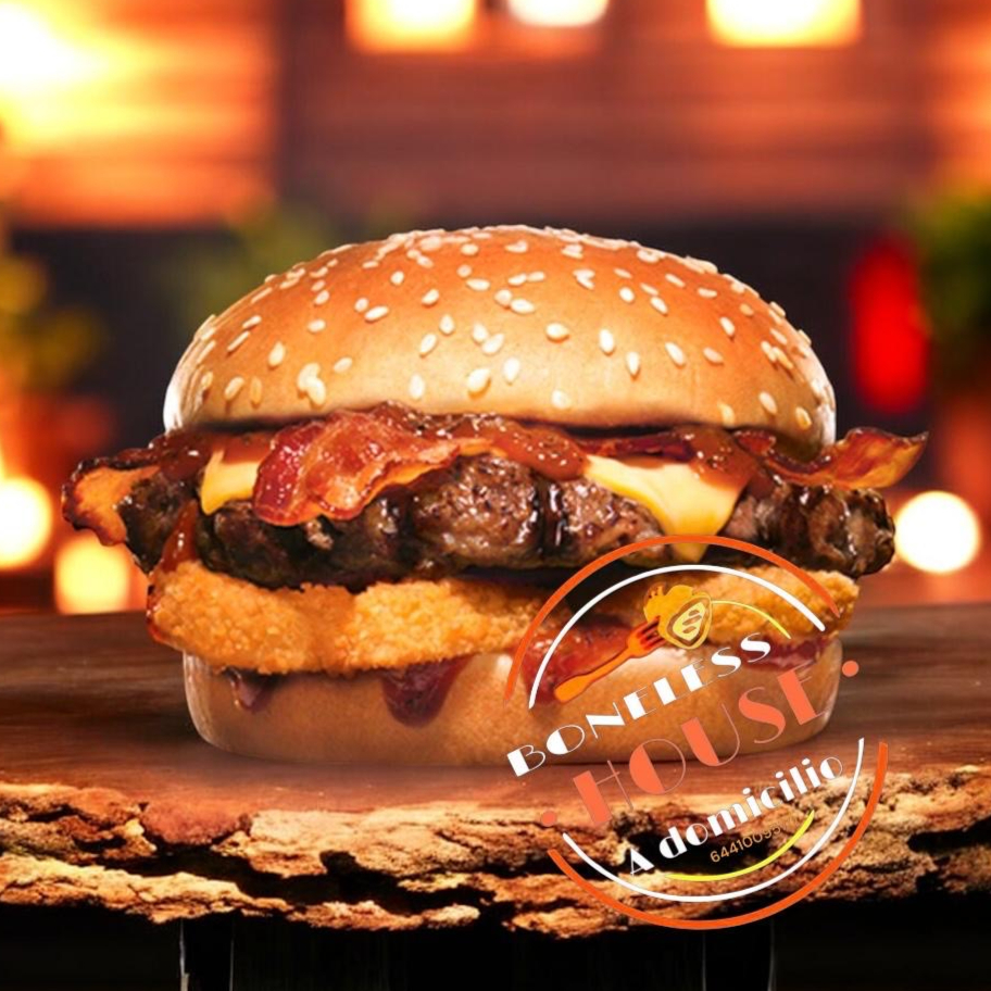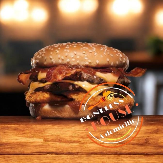 Deleitate de sabor con la deliciosa Doble Western House carne 100% sirloin,queso americano,tocino y aros de cebolla bañados con su riquisima salsa bbq.