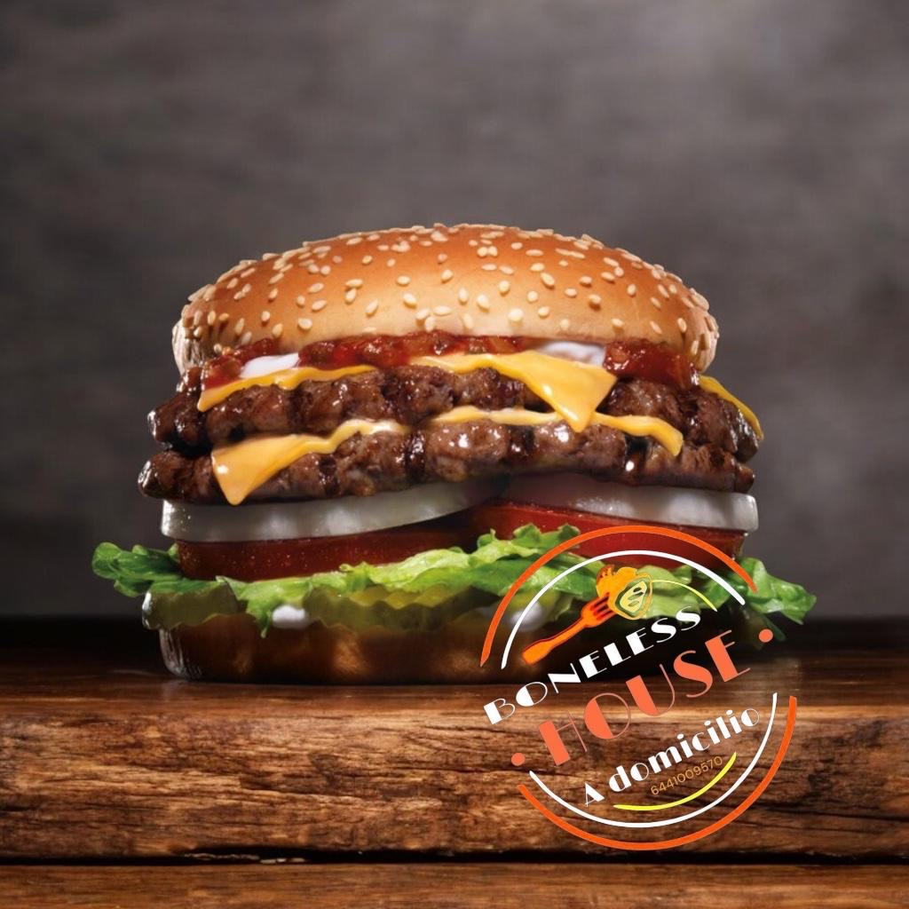 Disfruta del sabor de nuestra doble clasica house con carne 100% sirloin acompañada de queso americano,lechuga,tomate y cebolla.