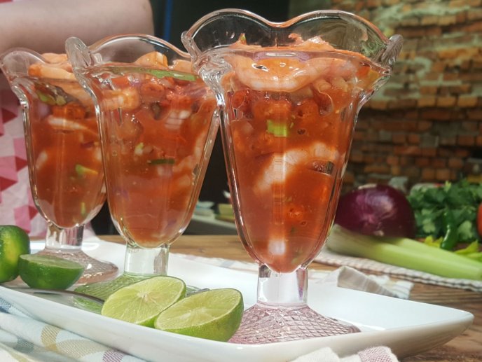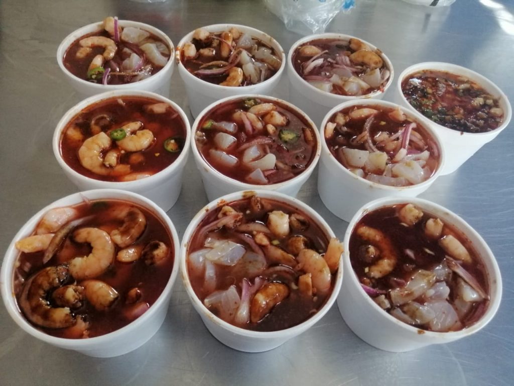 Camarón curtido, cebolla, pepino, chile serrano y salseado.