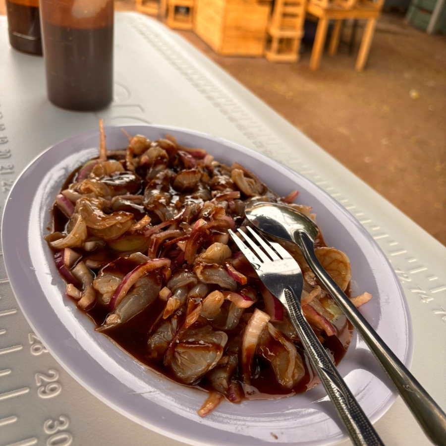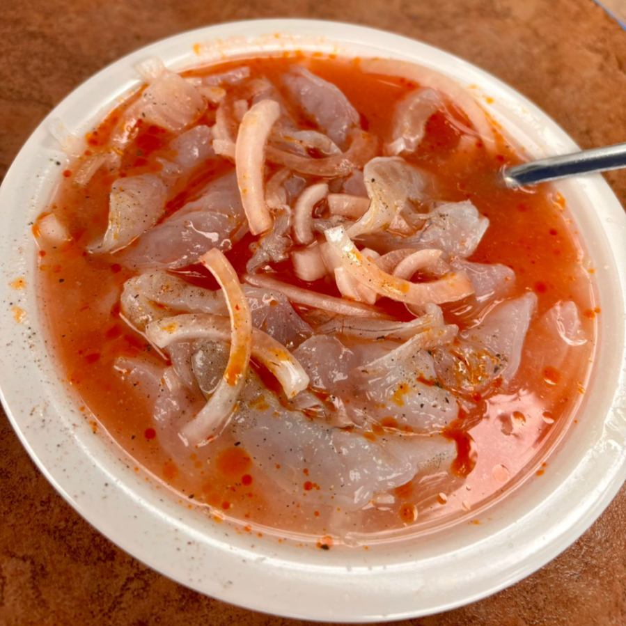 Callitos de pescado, cebolla blanca, limón, jugo de camarón, Clamato y salsa macha
