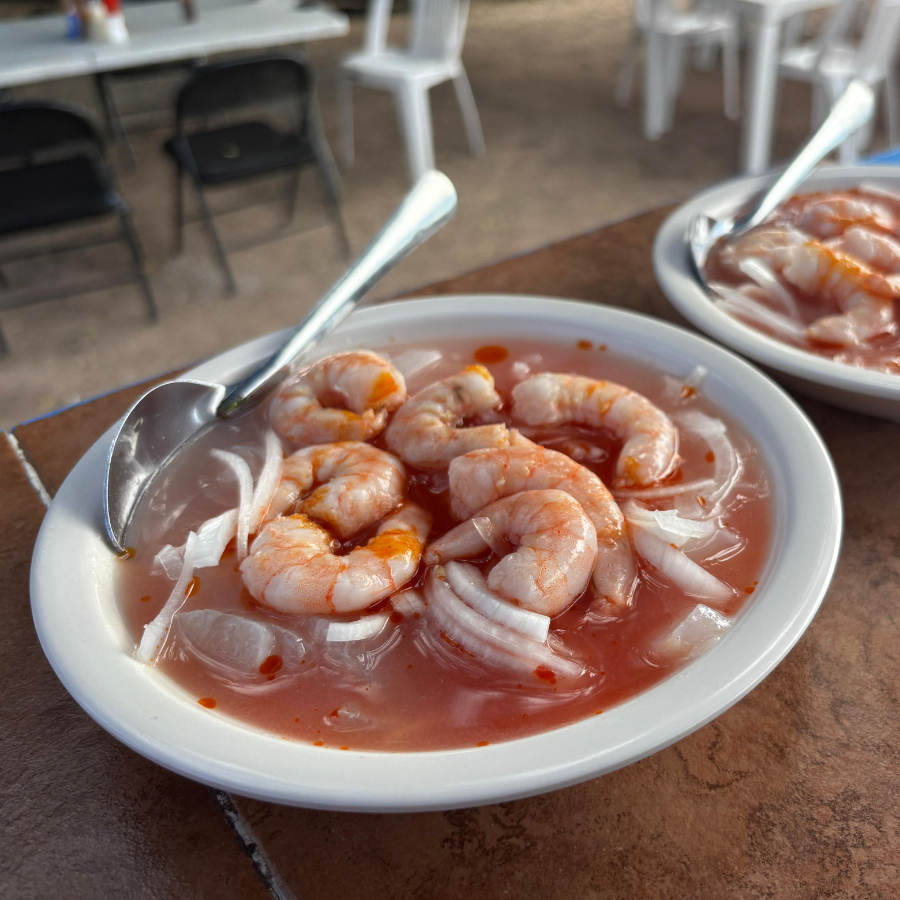 Camarón crudo fresco, cebolla morada, pepino, limón, sazonado sal y pimienta, salsa del diablo, salsa especial y clamato