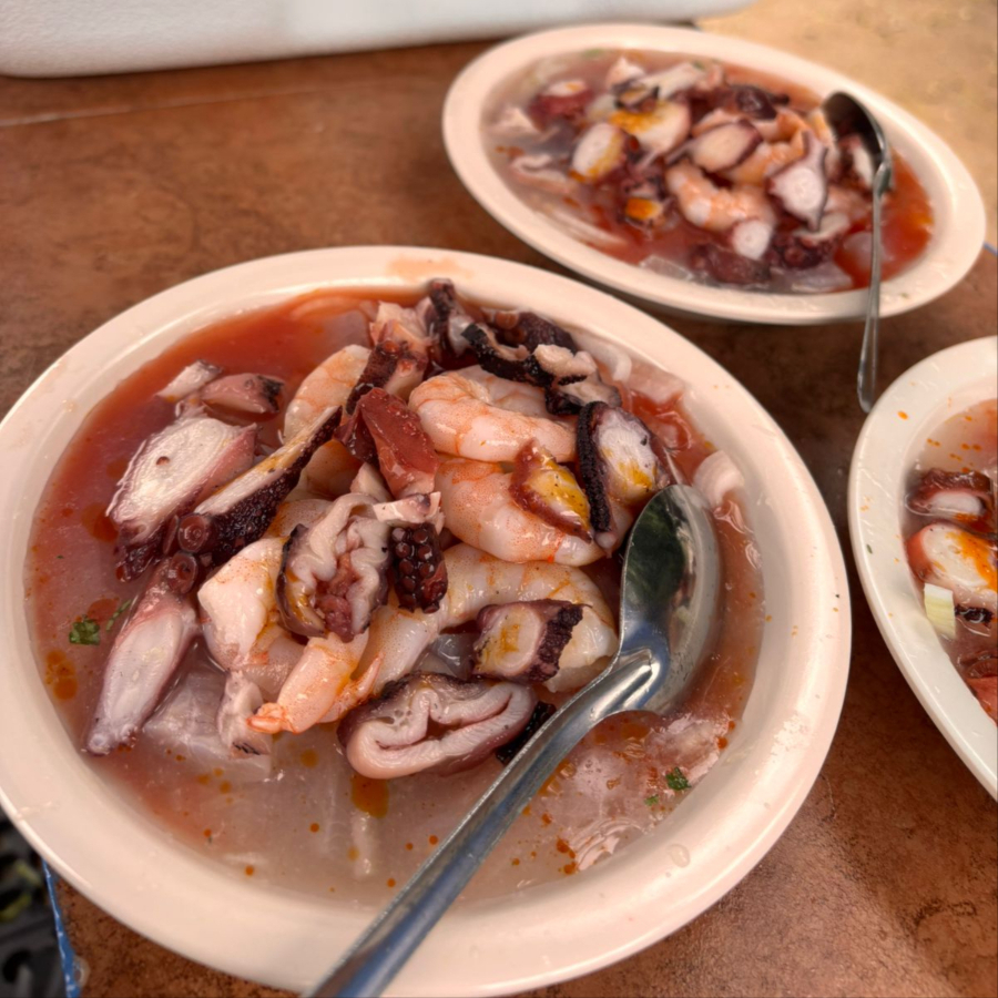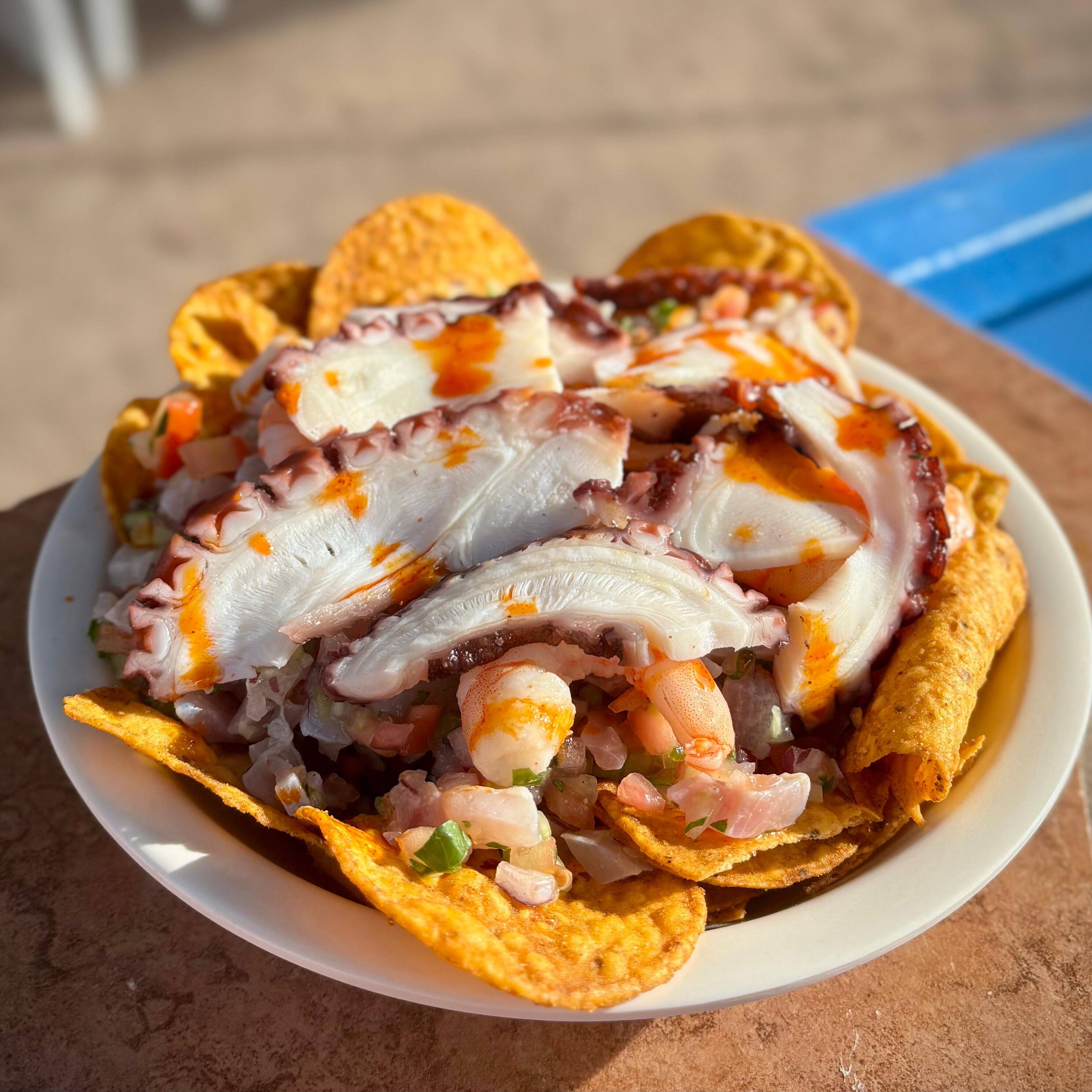 Ceviche de pescado, callitos, camarón cocido, pulpo, servido sobre tostitos con salsa macha jugo de camarón y clamato.