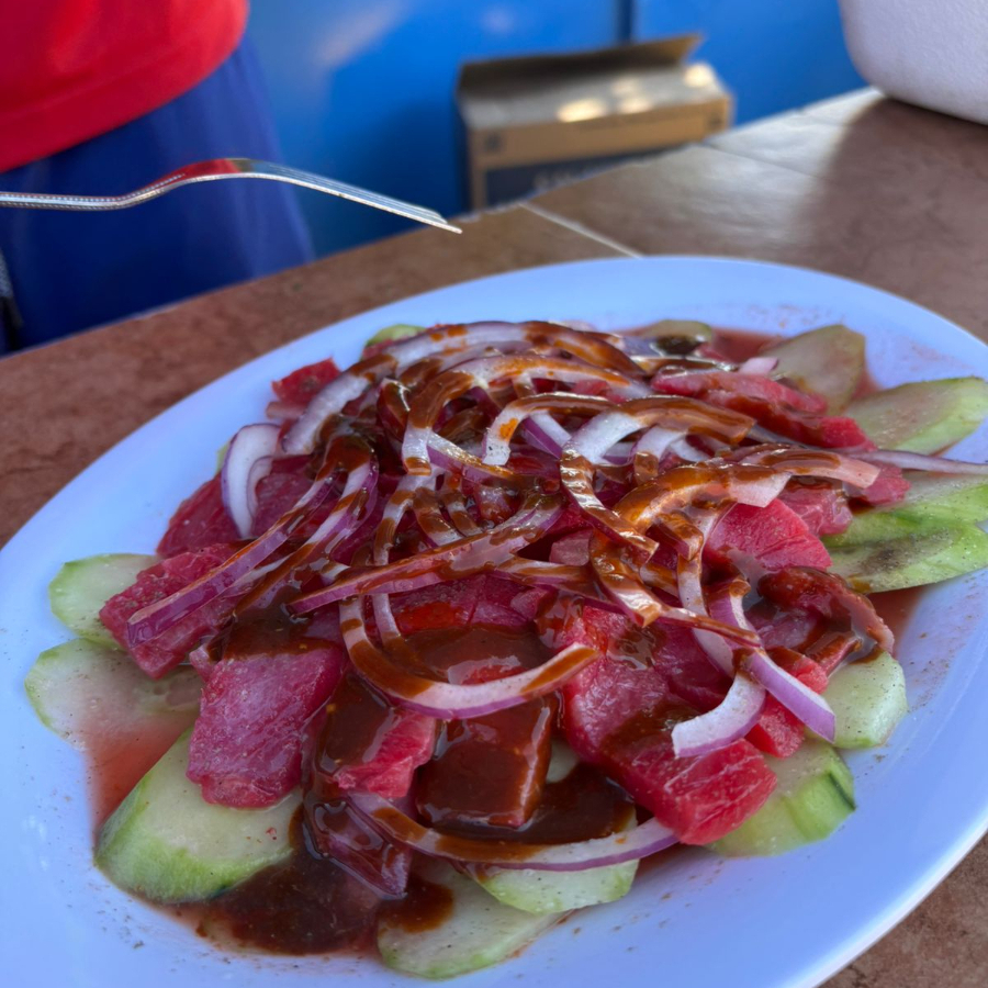 Atún fresco de Mazatlan, pepino, cebolla morada, serrano, salsa especial y clamato