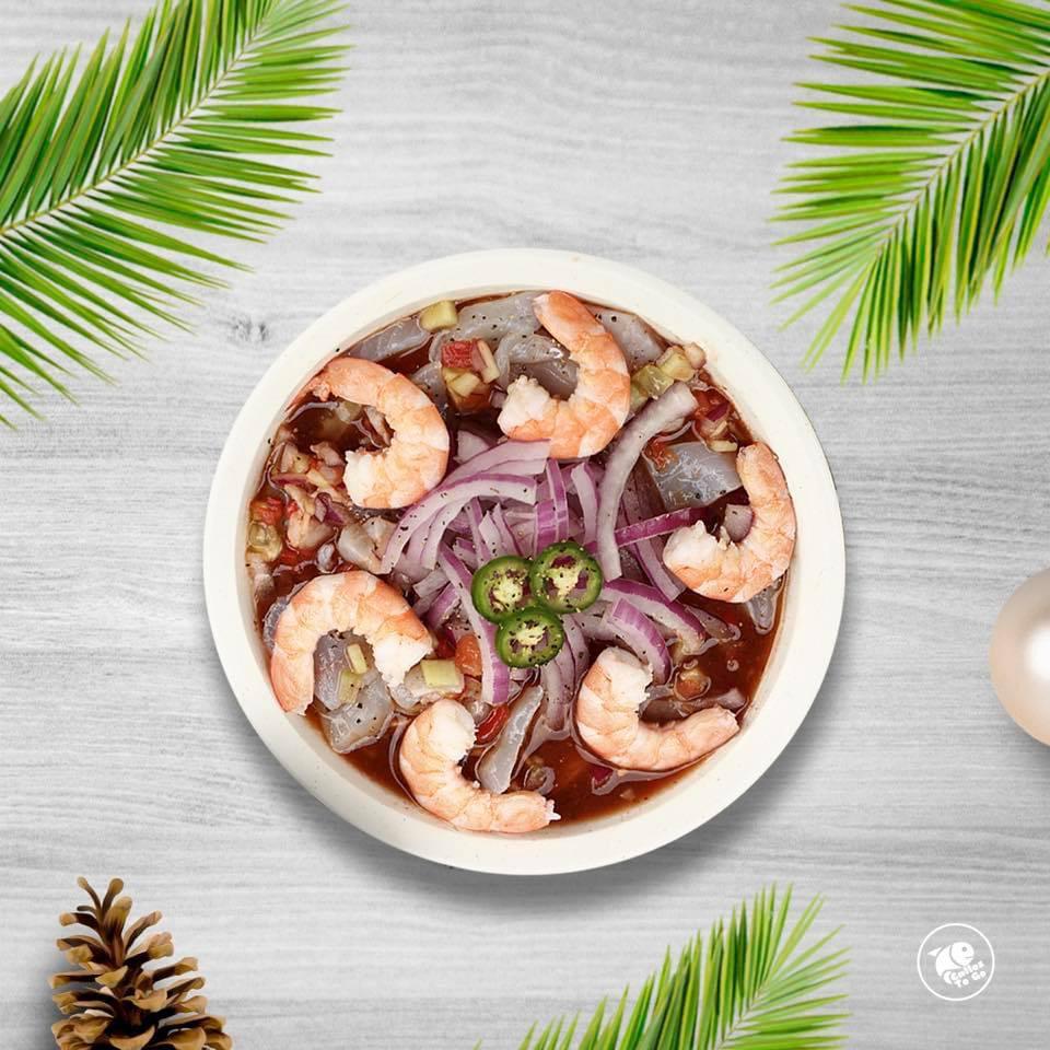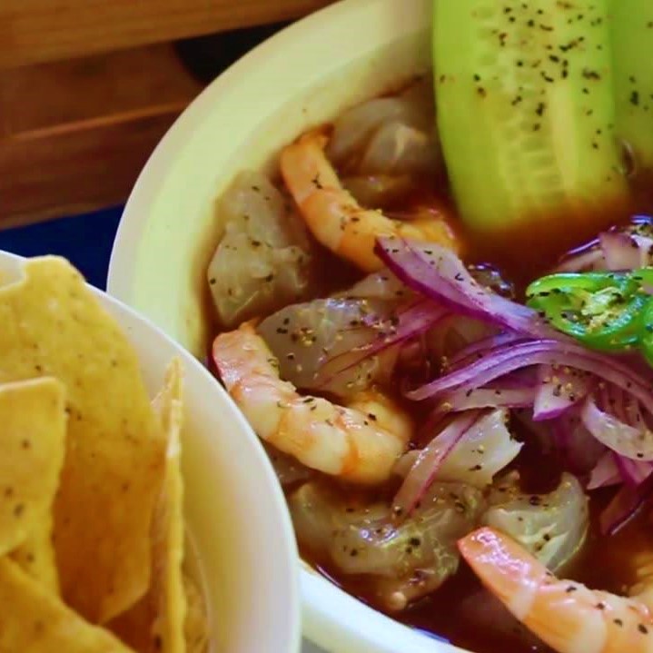 Callo de lobina, camarón crudo, cebolla morada, serrano, jugo de tomate prepatado