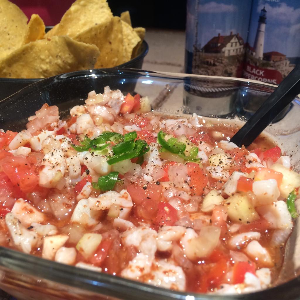 Ceviche, Callo de lobina, camarón cocido, cebolla morada, serrano y Clamato preparado