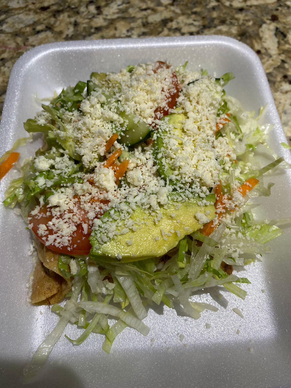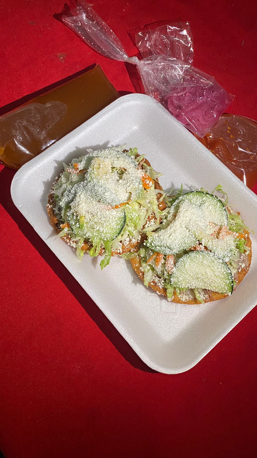 1 pieza Frijol, carne, lechuga, pepino, tomate, aguacate, salsa, cebolla.