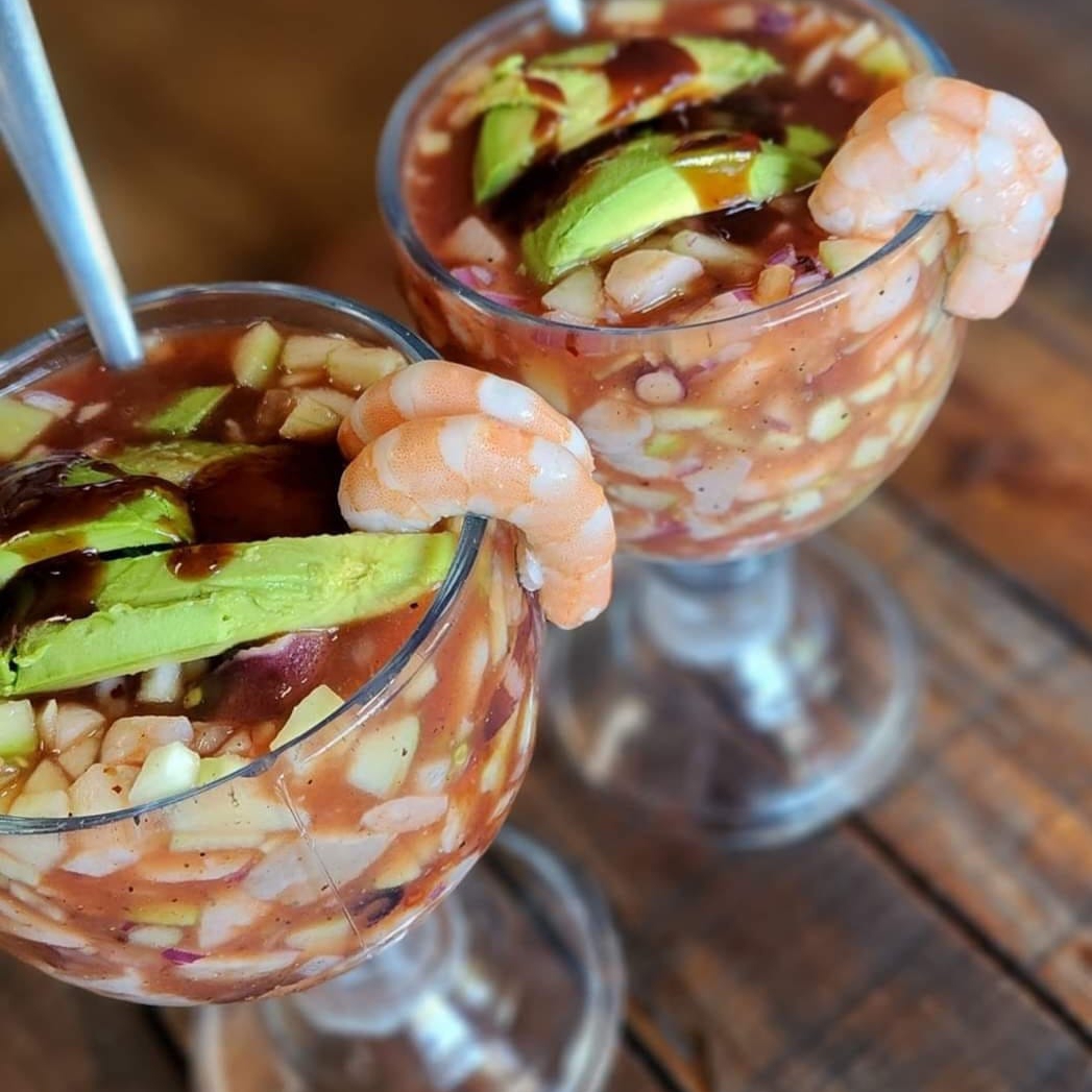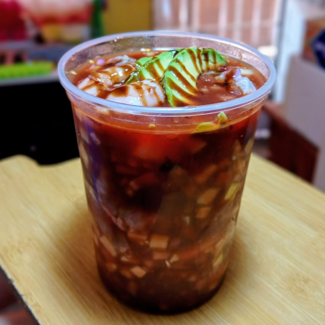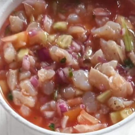 Pescado, cebolla morada, pepino, tomate, cilantro.