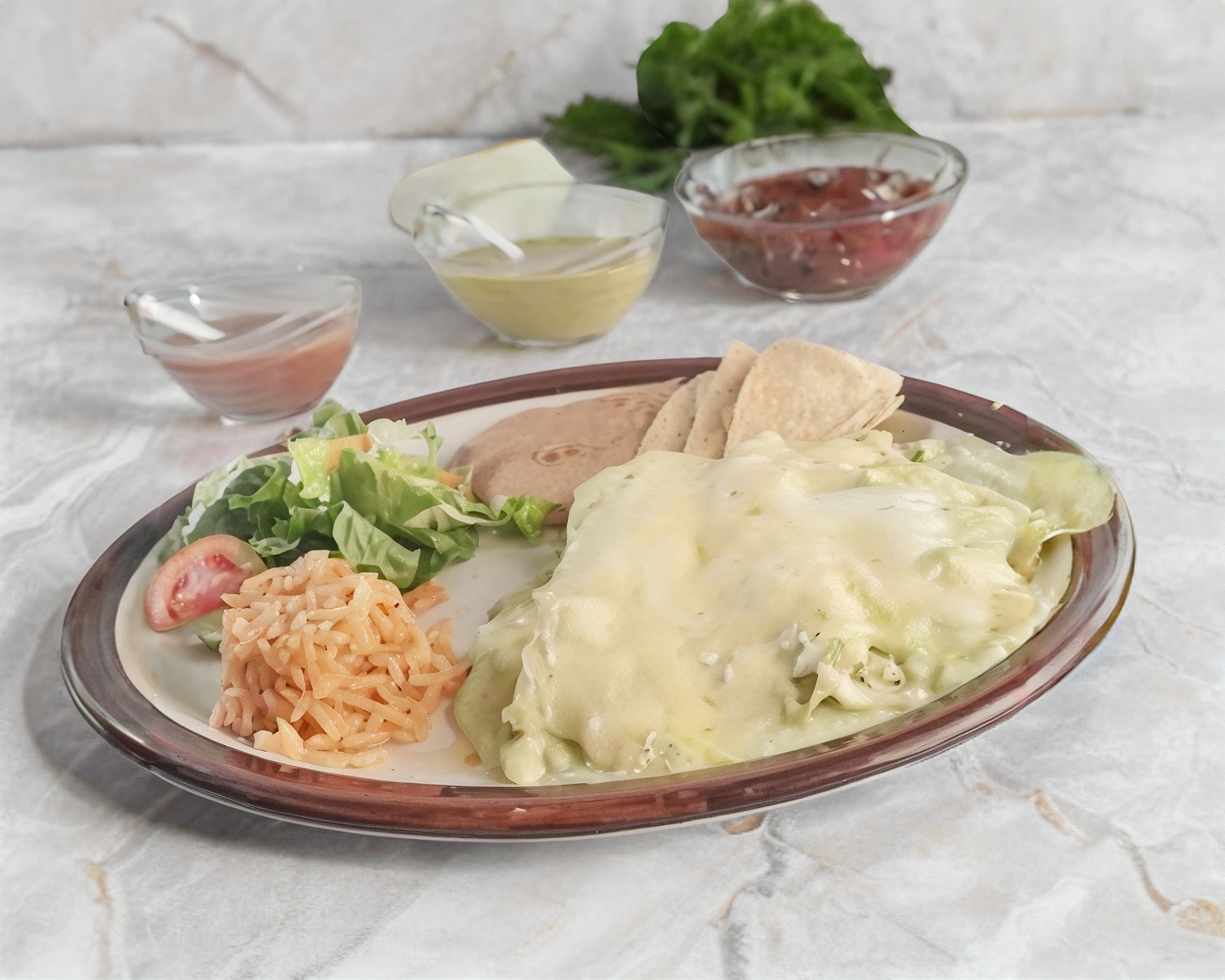 3 enchiladas de pollo acompañado de arroz, frijol y ensalada