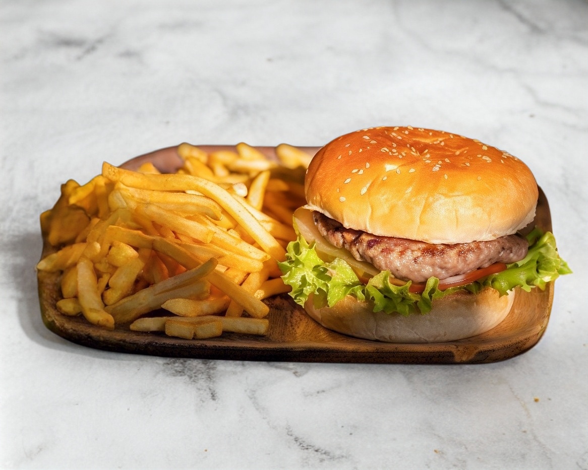 Carne de res con queso amarillo, tocino, lechuga, tomate, acompañado de papas francesas