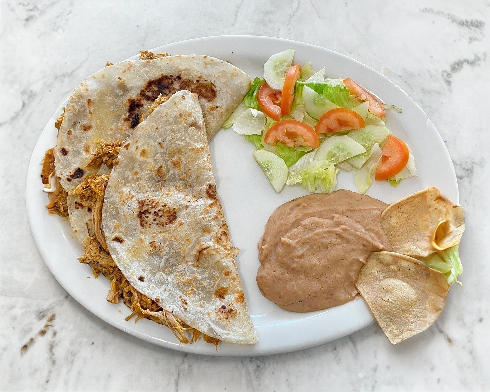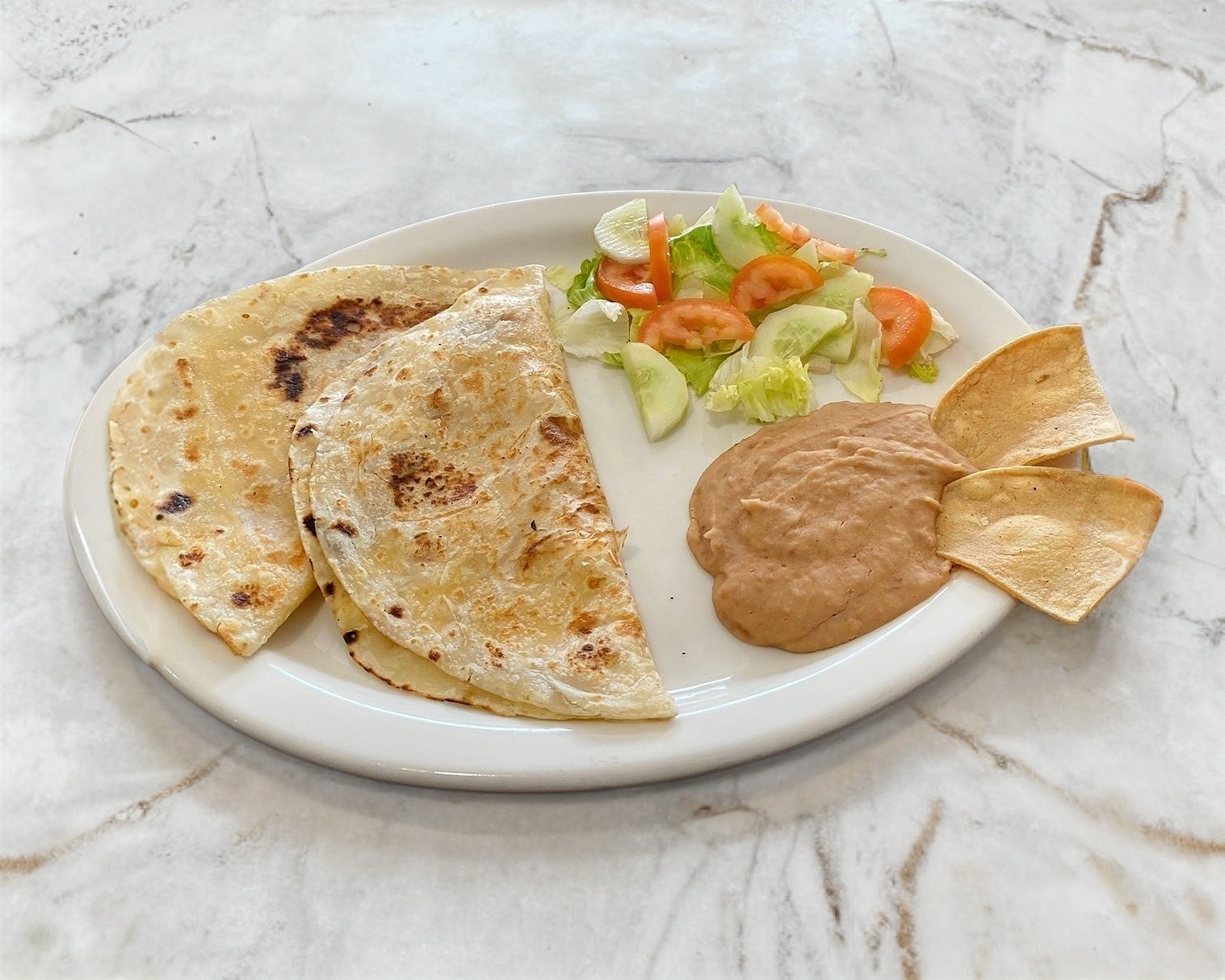 2 quesadillas acompañado de ensalada, frijoles y salsa roja