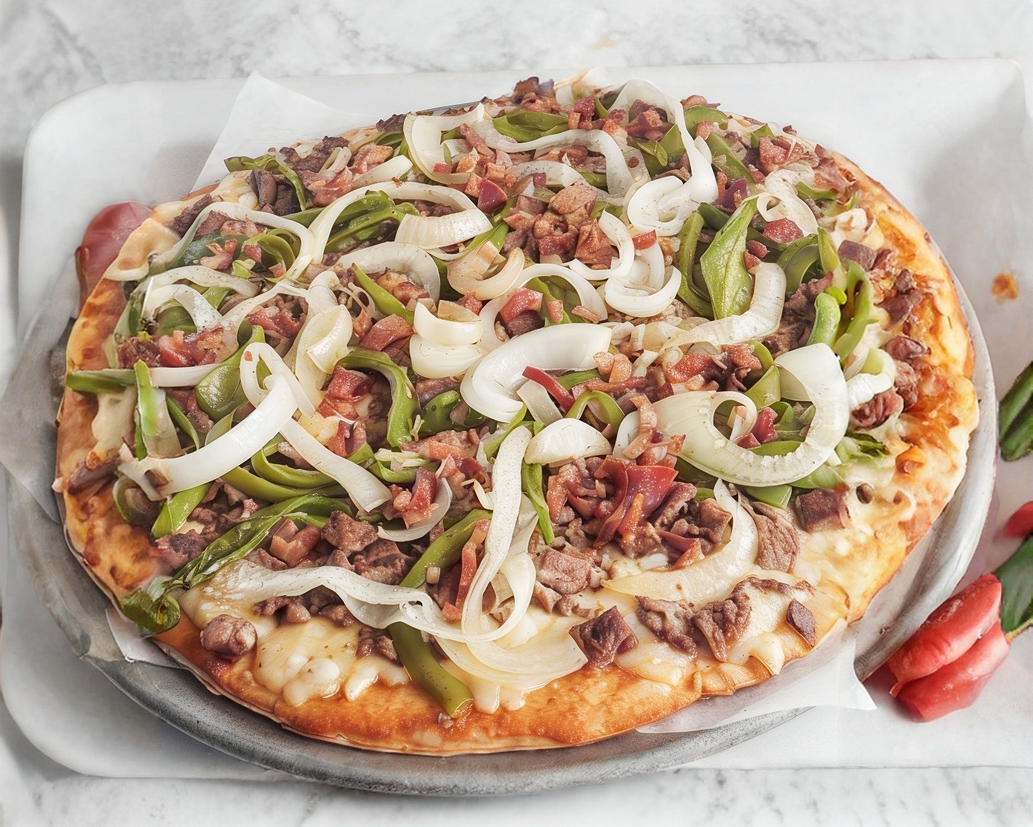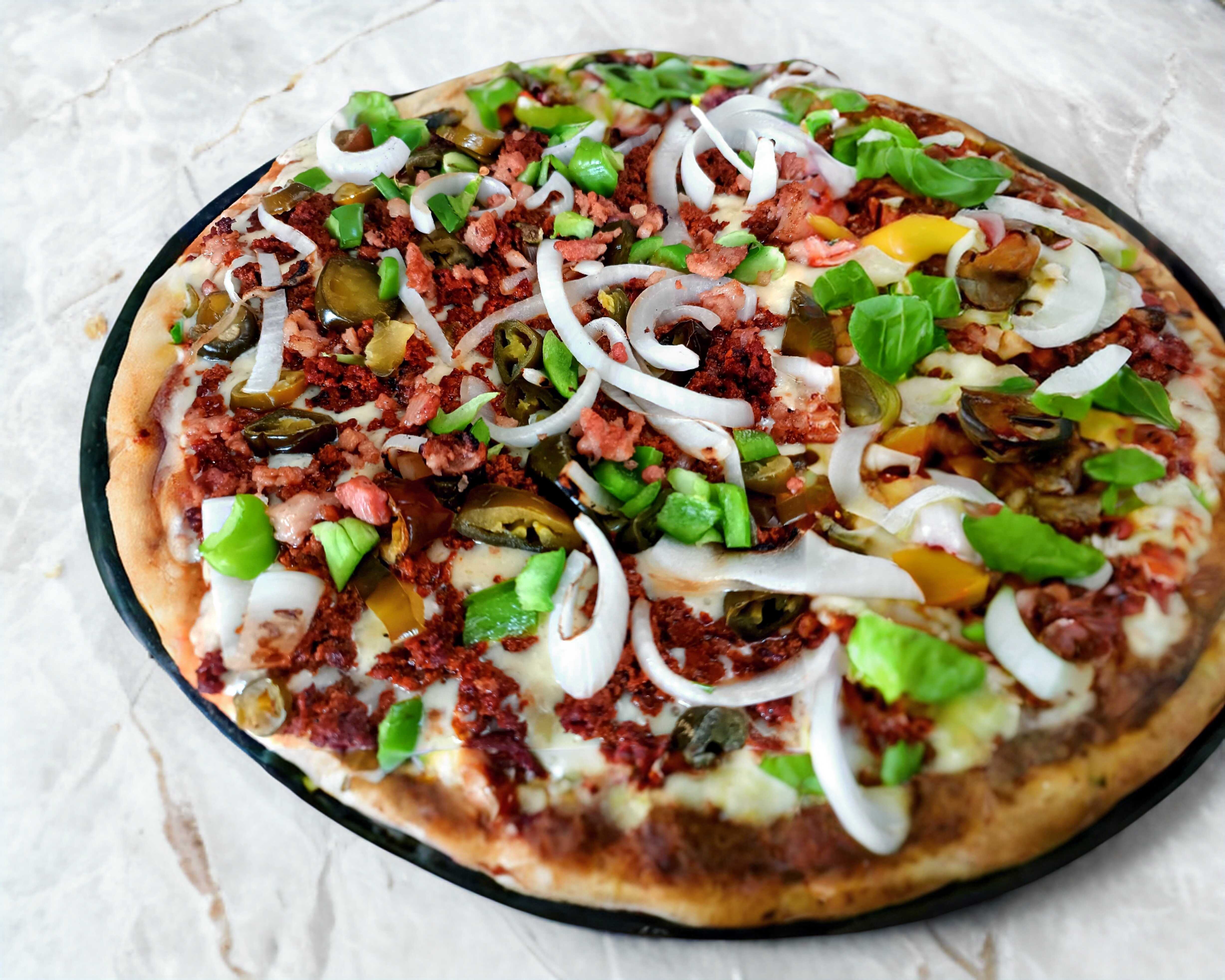 Chorizo, jalapeño, tocino, cebolla asada, pimiento