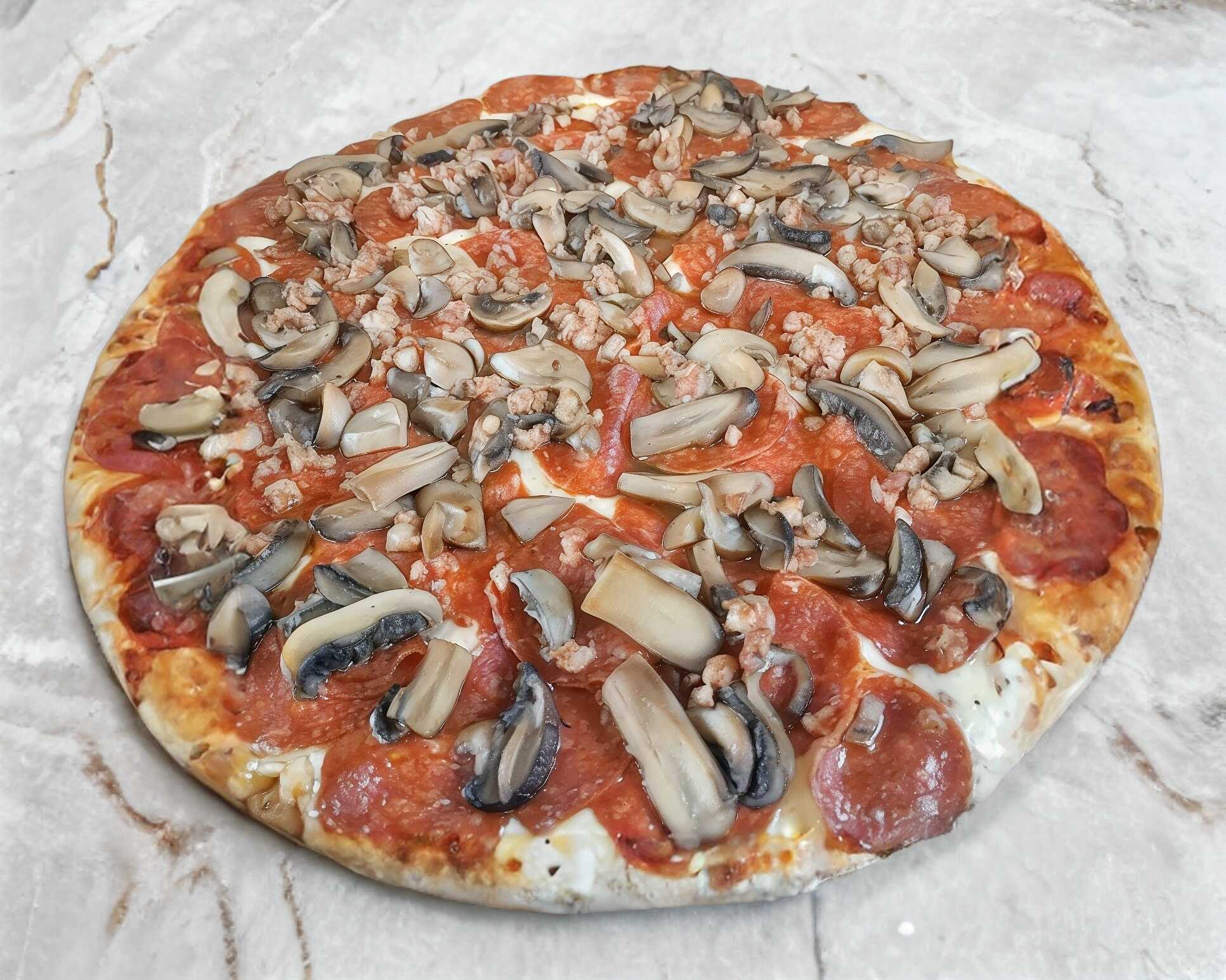 Contiene peperoni, champiñones, tocino acompañado de salsa y aderezo