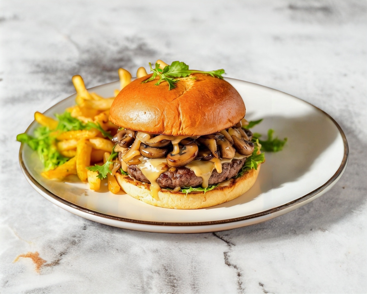 Carne de res con queso amarillo, tocino, queso chihuahua, champiñones, cebolla asada, lechuga, tomate, acompañado de papas francesas