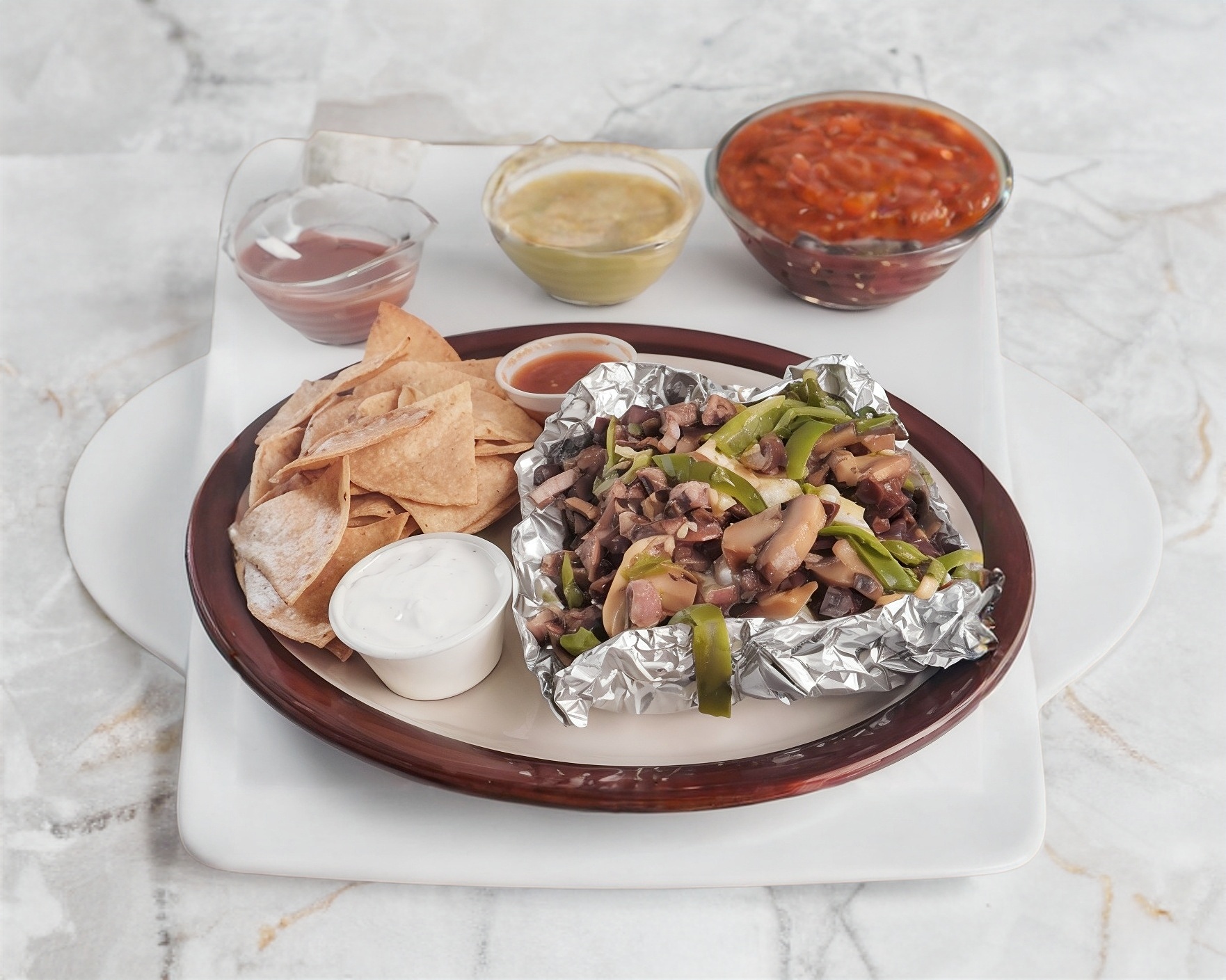 Carne asada, tocino, cebolla asada, chile verde asado acompañado de salsa y aderezo