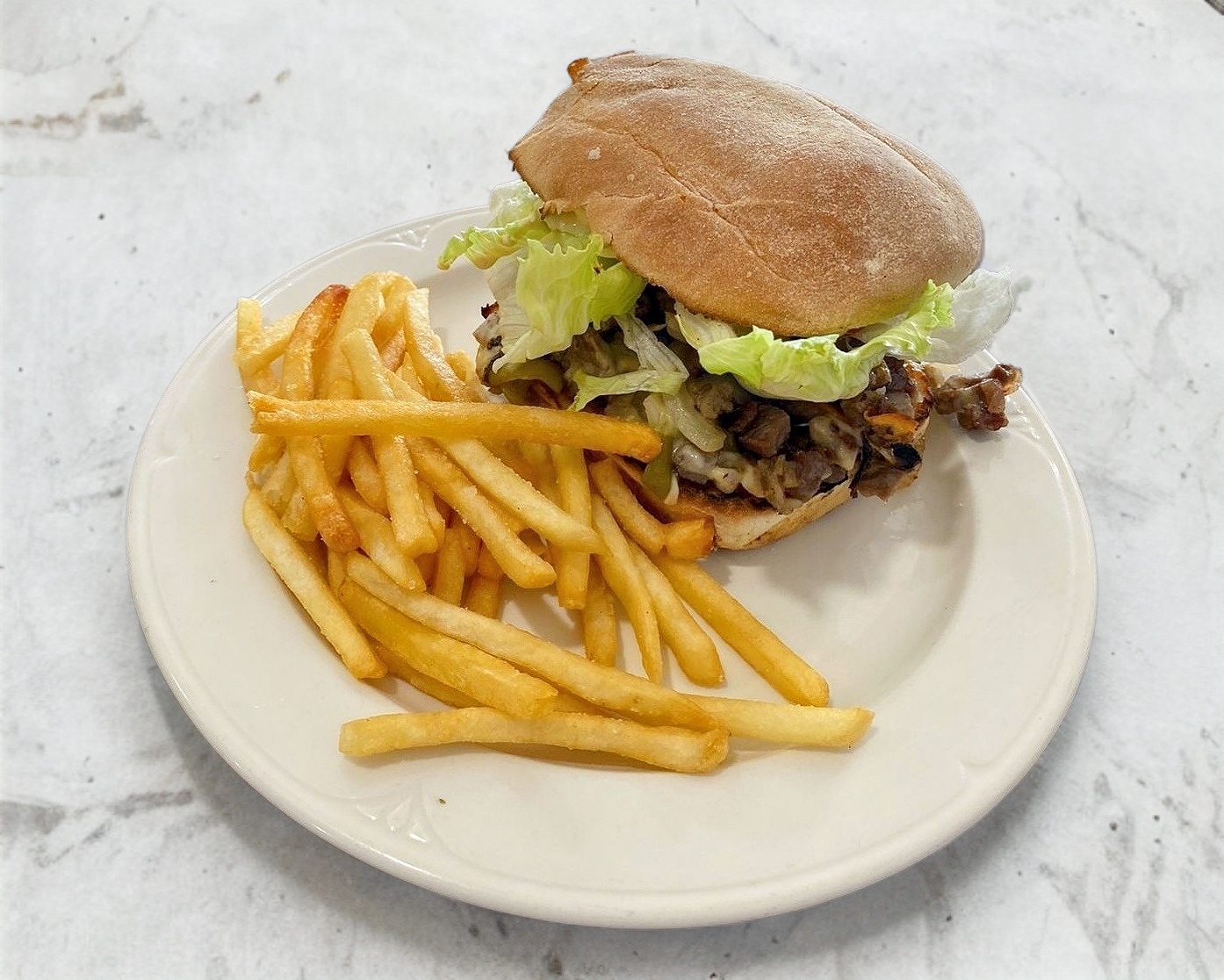 Carne asada, queso chihuahua, chile verde asado, cebolla asada, lechuga, tomate y jalapeño acompañado de papas francesas